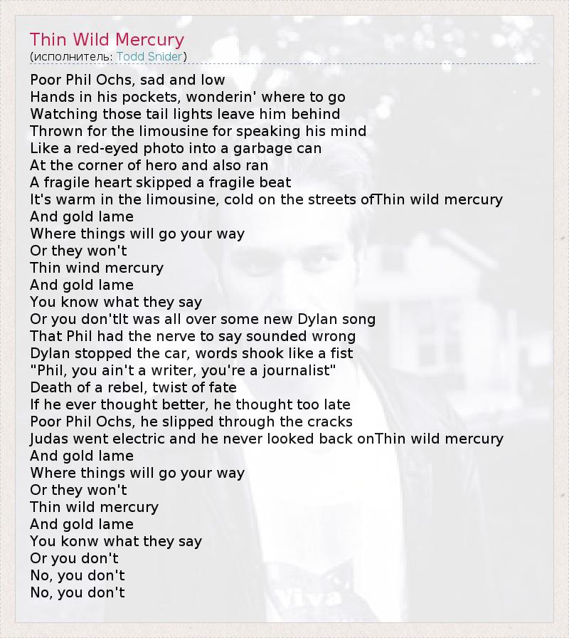 Poor Phil Ochs, sad and low Hands in his pockets, wonderin' where to go Watching those tail lights leave him behind Thrown for the limousine for speaking his mind Like a red-eyed photo into a garbage can At the corner of hero and also ran A fragile heart skipped a fragile beat It's warm in the limousine, cold on the streets ofThin wild mercury And gold lame Where things will go your way Or they won't Thin wind mercury And gold lame You know what they say Or you don'tIt was all over some new Dylan song That Phil had the nerve to say sounded wrong Dylan stopped the car, words shook like a fist "Phil, you ain't a writer, you're a journalist" Death of a rebel, twist of fate If he ever thought better, he thought too late Poor Phil Ochs, he slipped through the cracks Judas went electric and he never looked back onThin wild mercury And gold lame Where things will go your way Or they won't Thin wild mercury And gold lame You konw what they say Or you don't No, you don't No, you don't