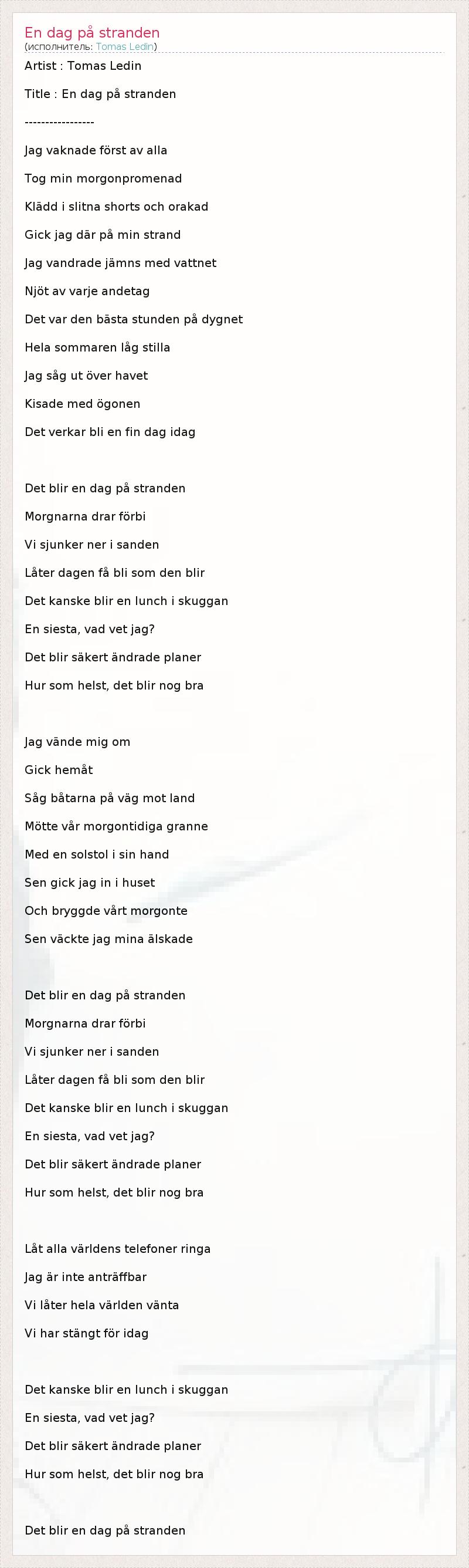 Artist : Tomas Ledin Title : En dag på stranden ----------------- Jag vaknade först av alla Tog min morgonpromenad Klädd i slitna shorts och orakad Gick jag där på min strand Jag vandrade jämns med vattnet Njöt av varje andetag Det var den bästa stunden på dygnet Hela sommaren låg stilla Jag såg ut över havet Kisade med ögonen Det verkar bli en fin dag idag Det blir en dag på stranden Morgnarna drar förbi Vi sjunker ner i sanden Låter dagen få bli som den blir Det kanske blir en lunch i skuggan En siesta, vad vet jag? Det blir säkert ändrade planer Hur som helst, det blir nog bra Jag vände mig om Gick hemåt Såg båtarna på väg mot land Mötte vår morgontidiga granne Med en solstol i sin hand Sen gick jag in i huset Och bryggde vårt morgonte Sen väckte jag mina älskade Det blir en dag på stranden Morgnarna drar förbi Vi sjunker ner i sanden Låter dagen få bli som den blir Det kanske blir en lunch i skuggan En siesta, vad vet jag? Det blir säkert ändrade planer Hur som helst, det blir nog bra Låt alla världens telefoner ringa Jag är inte anträffbar Vi låter hela världen vänta Vi har stängt för idag Det kanske blir en lunch i skuggan En siesta, vad vet jag? Det blir säkert ändrade planer Hur som helst, det blir nog bra Det blir en dag på stranden