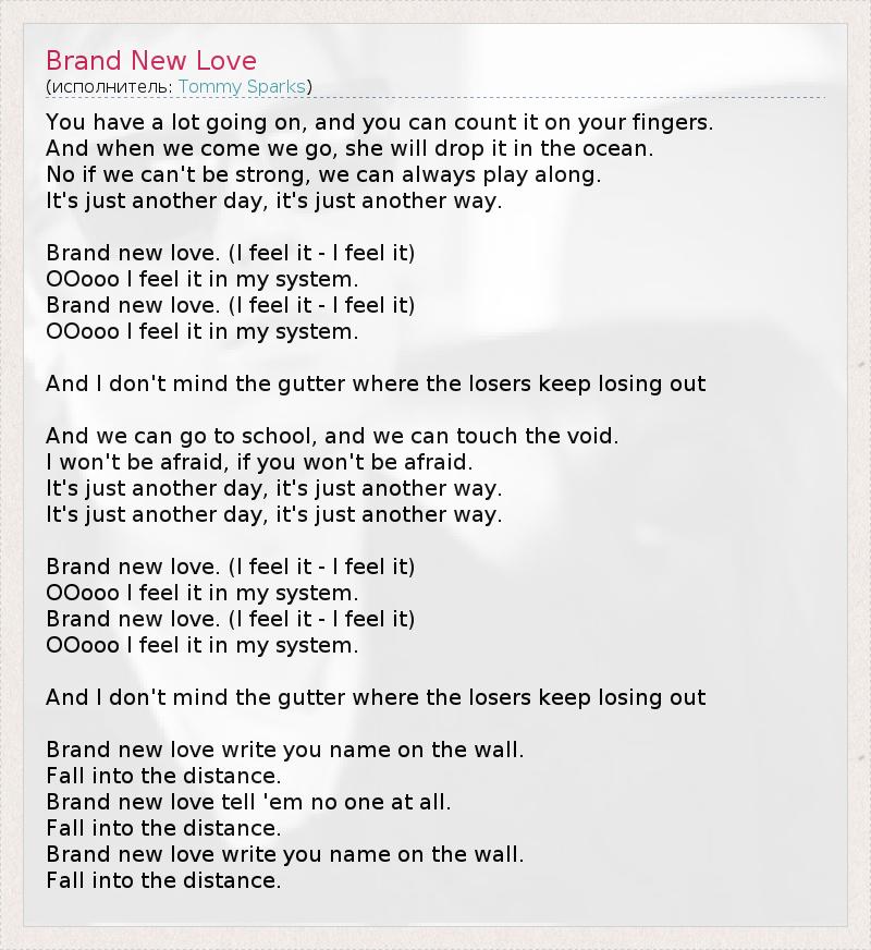 You have a lot going on, and you can count it on your fingers. And when we come we go, she will drop it in the ocean. No if we can't be strong, we can always play along. It's just another day, it's just another way. Brand new love. (I feel it - I feel it) OOooo I feel it in my system. Brand new love. (I feel it - I feel it) OOooo I feel it in my system. And I don't mind the gutter where the losers keep losing out And we can go to school, and we can touch the void. I won't be afraid, if you won't be afraid. It's just another day, it's just another way. It's just another day, it's just another way. Brand new love. (I feel it - I feel it) OOooo I feel it in my system. Brand new love. (I feel it - I feel it) OOooo I feel it in my system. And I don't mind the gutter where the losers keep losing out Brand new love write you name on the wall. Fall into the distance. Brand new love tell 'em no one at all. Fall into the distance. Brand new love write you name on the wall. Fall into the distance.