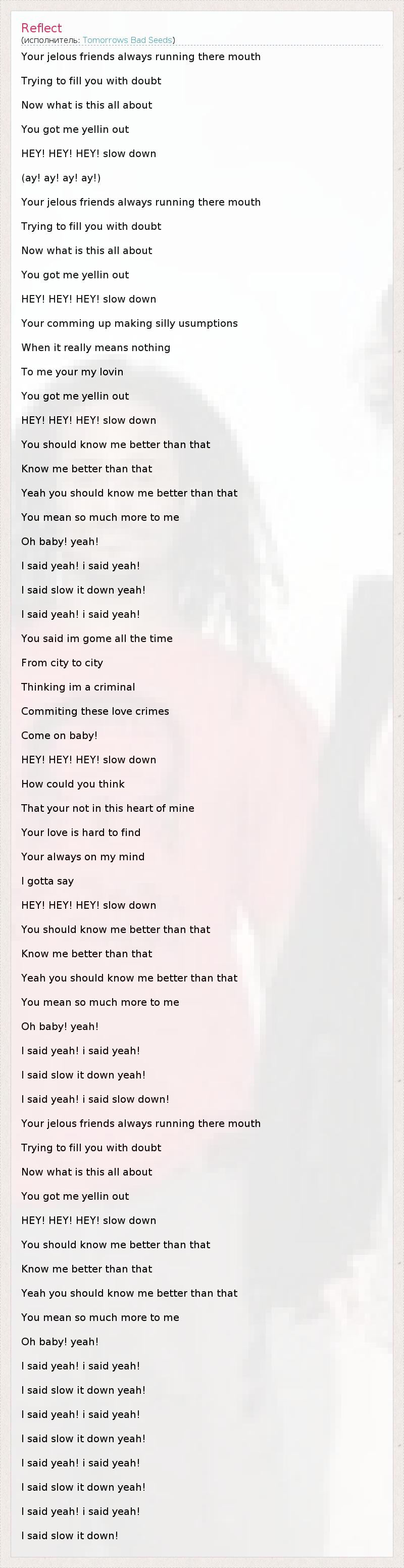 Your jelous friends always running there mouth Trying to fill you with doubt Now what is this all about You got me yellin out HEY! HEY! HEY! slow down (ay! ay! ay! ay!) Your jelous friends always running there mouth Trying to fill you with doubt Now what is this all about You got me yellin out HEY! HEY! HEY! slow down Your comming up making silly usumptions When it really means nothing To me your my lovin You got me yellin out HEY! HEY! HEY! slow down You should know me better than that Know me better than that Yeah you should know me better than that You mean so much more to me Oh baby! yeah! I said yeah! i said yeah! I said slow it down yeah! I said yeah! i said yeah! You said im gome all the time From city to city Thinking im a criminal Commiting these love crimes Come on baby! HEY! HEY! HEY! slow down How could you think That your not in this heart of mine Your love is hard to find Your always on my mind I gotta say HEY! HEY! HEY! slow down You should know me better than that Know me better than that Yeah you should know me better than that You mean so much more to me Oh baby! yeah! I said yeah! i said yeah! I said slow it down yeah! I said yeah! i said slow down! Your jelous friends always running there mouth Trying to fill you with doubt Now what is this all about You got me yellin out HEY! HEY! HEY! slow down You should know me better than that Know me better than that Yeah you should know me better than that You mean so much more to me Oh baby! yeah! I said yeah! i said yeah! I said slow it down yeah! I said yeah! i said yeah! I said slow it down yeah! I said yeah! i said yeah! I said slow it down yeah! I said yeah! i said yeah! I said slow it down!