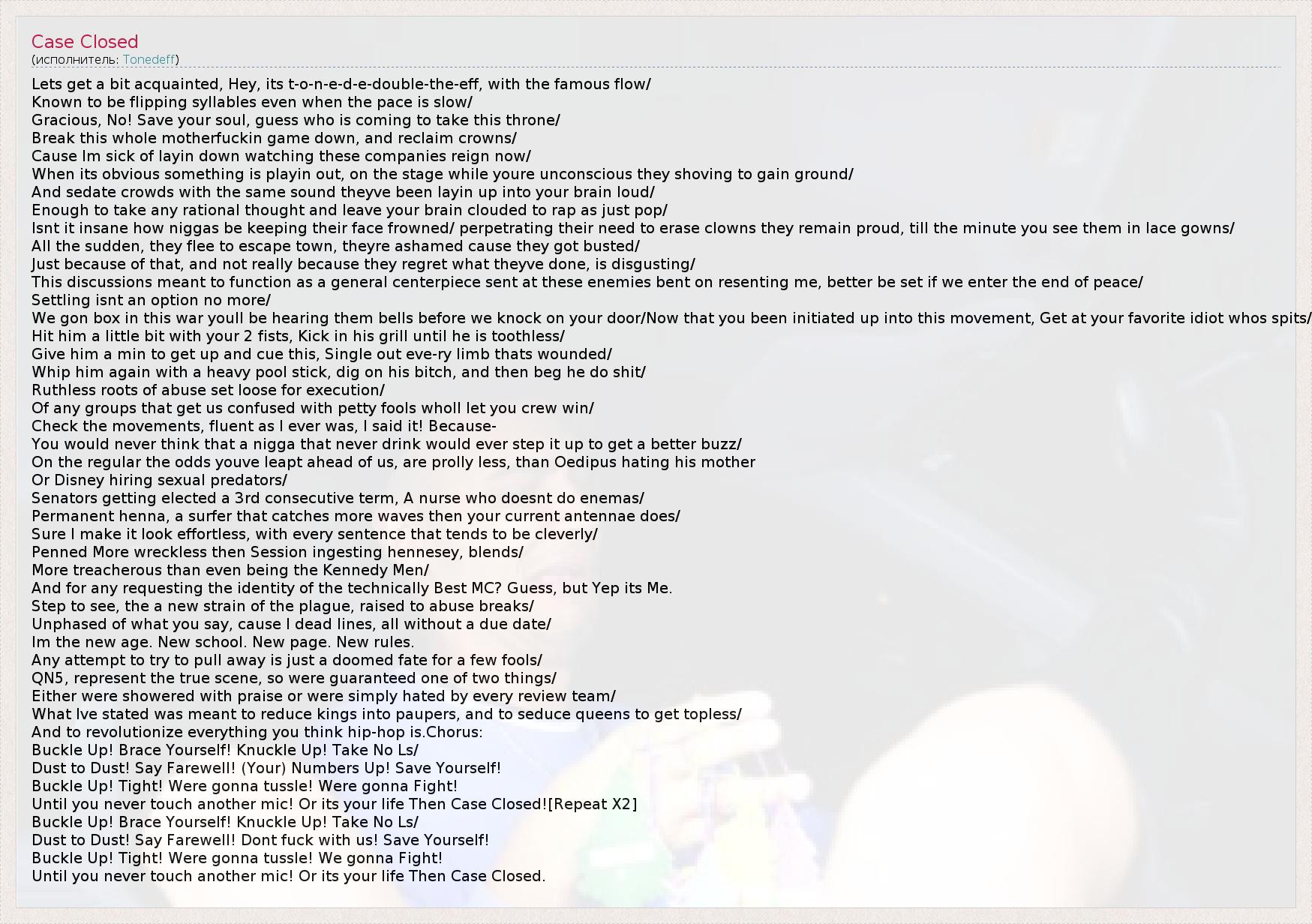Lets get a bit acquainted, Hey, its t-o-n-e-d-e-double-the-eff, with the famous flow/ Known to be flipping syllables even when the pace is slow/ Gracious, No! Save your soul, guess who is coming to take this throne/ Break this whole motherfuckin game down, and reclaim crowns/ Cause Im sick of layin down watching these companies reign now/ When its obvious something is playin out, on the stage while youre unconscious they shoving to gain ground/ And sedate crowds with the same sound theyve been layin up into your brain loud/ Enough to take any rational thought and leave your brain clouded to rap as just pop/ Isnt it insane how niggas be keeping their face frowned/ perpetrating their need to erase clowns they remain proud, till the minute you see them in lace gowns/ All the sudden, they flee to escape town, theyre ashamed cause they got busted/ Just because of that, and not really because they regret what theyve done, is disgusting/ This discussions meant to function as a general centerpiece sent at these enemies bent on resenting me, better be set if we enter the end of peace/ Settling isnt an option no more/ We gon box in this war youll be hearing them bells before we knock on your door/Now that you been initiated up into this movement, Get at your favorite idiot whos spits/ Hit him a little bit with your 2 fists, Kick in his grill until he is toothless/ Give him a min to get up and cue this, Single out eve-ry limb thats wounded/ Whip him again with a heavy pool stick, dig on his bitch, and then beg he do shit/ Ruthless roots of abuse set loose for execution/ Of any groups that get us confused with petty fools wholl let you crew win/ Check the movements, fluent as I ever was, I said it! Because- You would never think that a nigga that never drink would ever step it up to get a better buzz/ On the regular the odds youve leapt ahead of us, are prolly less, than Oedipus hating his mother Or Disney hiring sexual predators/ Senators getting elected a 3rd consecutive term, A nurse who doesnt do enemas/ Permanent henna, a surfer that catches more waves then your current antennae does/ Sure I make it look effortless, with every sentence that tends to be cleverly/ Penned More wreckless then Session ingesting hennesey, blends/ More treacherous than even being the Kennedy Men/ And for any requesting the identity of the technically Best MC? Guess, but Yep its Me. Step to see, the a new strain of the plague, raised to abuse breaks/ Unphased of what you say, cause I dead lines, all without a due date/ Im the new age. New school. New page. New rules. Any attempt to try to pull away is just a doomed fate for a few fools/ QN5, represent the true scene, so were guaranteed one of two things/ Either were showered with praise or were simply hated by every review team/ What Ive stated was meant to reduce kings into paupers, and to seduce queens to get topless/ And to revolutionize everything you think hip-hop is.Chorus: Buckle Up! Brace Yourself! Knuckle Up! Take No Ls/ Dust to Dust! Say Farewell! (Your) Numbers Up! Save Yourself! Buckle Up! Tight! Were gonna tussle! Were gonna Fight! Until you never touch another mic! Or its your life Then Case Closed![Repeat X2] Buckle Up! Brace Yourself! Knuckle Up! Take No Ls/ Dust to Dust! Say Farewell! Dont fuck with us! Save Yourself! Buckle Up! Tight! Were gonna tussle! We gonna Fight! Until you never touch another mic! Or its your life Then Case Closed.