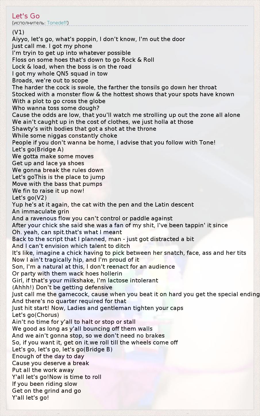 (V1) Aiyyo, let's go, what's poppin, I don't know, I'm out the door Just call me. I got my phone I'm tryin to get up into whatever possible Floss on some hoes that's down to go Rock & Roll Lock & load, when the boss is on the road I got my whole QN5 squad in tow Broads, we're out to scope The harder the cock is swole, the farther the tonsils go down her throat Stocked with a monster flow & the hottest shows that your spots have known With a plot to go cross the globe Who wanna toss some dough? Cause the odds are low, that you'll watch me strolling up out the zone all alone We ain't caught up in the cost of clothes, we just holla at those Shawty's with bodies that got a shot at the throne While some niggas constantly choke People if you don't wanna be home, I advise that you follow with Tone! Let's go(Bridge A) We gotta make some moves Get up and lace ya shoes We gonna break the rules down Let's goThis is the place to jump Move with the bass that pumps We fin to raise it up now! Let's go(V2) Yup he's at it again, the cat with the pen and the Latin descent An immaculate grin And a ravenous flow you can't control or paddle against After your chick she said she was a fan of my shit, I've been tappin' it since Oh. yeah, can spit.that's what I meant Back to the script that I planned, man - just got distracted a bit And I can't envision which talent to ditch It's like, imagine a chick having to pick between her snatch, face, ass and her tits Now I ain't tragically hip, and I'm proud of it Son, I'm a natural at this, I don't reenact for an audience Or party with them wack hoes hollerin Girl, if that's your milkshake, I'm lactose intolerant (Ahhh!) Don't be getting defensive Just call me the gamecock, cause when you beat it on hard you get the special ending And there's no quarter required for that Just hit start! Now, Ladies and gentleman tighten your caps Let's go(Chorus) Ain't no time for y'all to halt or stop or stall We good as long as y'all bouncing off them walls And we ain't gonna stop, so we don't need no brakes So, if you want it, get on it.we roll till the wheels come off Let's go, let's go, let's go(Bridge B) Enough of the day to day Cause you deserve a break Put all the work away Y'all let's go!Now is time to roll If you been riding slow Get on the grind and go Y'all let's go!