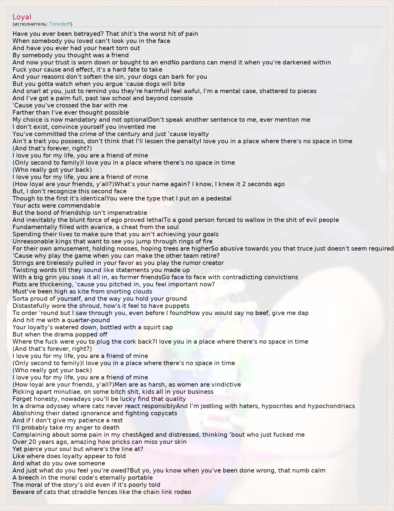 Это интересно:Tonedeff (born Anthony Rojas on December 14, 1978) is an American rapper, producer, and singer-songwriter from Queens, New York City.Known for his breathless vocal performances, rapid-fire delivery, which is alleged to be among the fastest in hip hop history at 13.5 syllables per second, he is said by critics as having "the best flows" of the current generation of emcees. Having developed a reputation as a self-sufficient artist who has been known to design his own album covers and edit his own videos, he is also known to sing and play piano on his tracks, as well as self-produce them.Tonedeff first gained national recognition on the underground hip hop scene after winning... продолжение