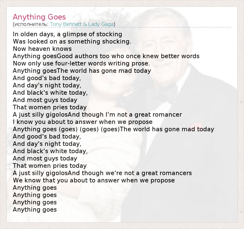 In olden days, a glimpse of stocking Was looked on as something shocking. Now heaven knows Anything goesGood authors too who once knew better words Now only use four-letter words writing prose. Anything goesThe world has gone mad today And good's bad today, And day's night today, And black's white today, And most guys today That women pries today A just silly gigolosAnd though I'm not a great romancer I know you about to answer when we propose Anything goes (goes) (goes) (goes)The world has gone mad today And good's bad today, And day's night today, And black's white today, And most guys today That women pries today A just silly gigolosAnd though we're not a great romancers We know that you about to answer when we propose Anything goes Anything goes Anything goes Anything goes