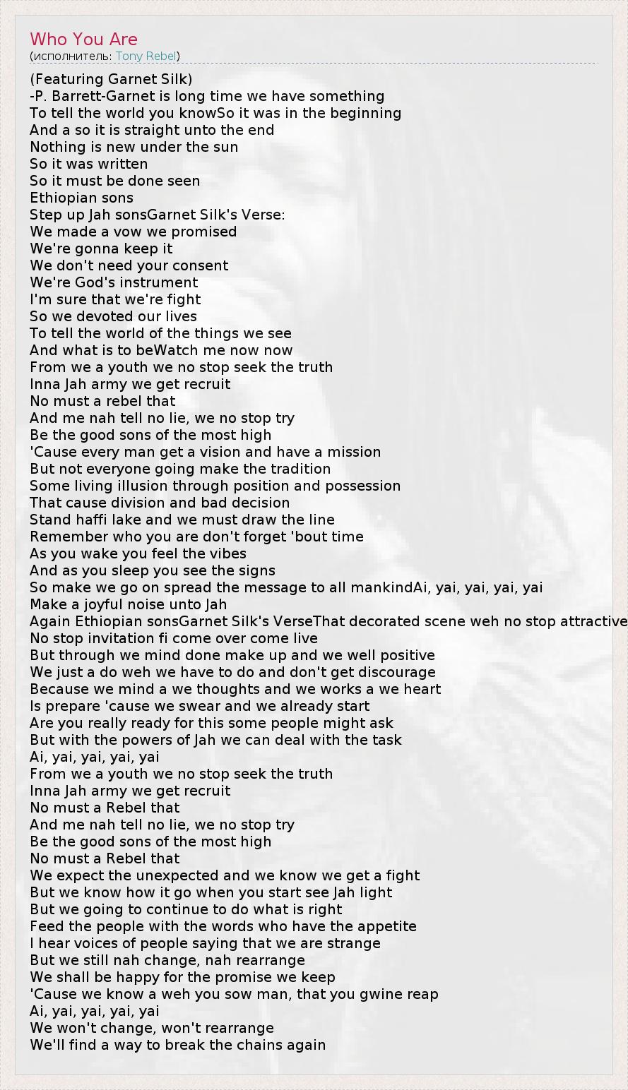 (Featuring Garnet Silk) -P. Barrett-Garnet is long time we have something To tell the world you knowSo it was in the beginning And a so it is straight unto the end Nothing is new under the sun So it was written So it must be done seen Ethiopian sons Step up Jah sonsGarnet Silk's Verse: We made a vow we promised We're gonna keep it We don't need your consent We're God's instrument I'm sure that we're fight So we devoted our lives To tell the world of the things we see And what is to beWatch me now now From we a youth we no stop seek the truth Inna Jah army we get recruit No must a rebel that And me nah tell no lie, we no stop try Be the good sons of the most high 'Cause every man get a vision and have a mission But not everyone going make the tradition Some living illusion through position and possession That cause division and bad decision Stand haffi lake and we must draw the line Remember who you are don't forget 'bout time As you wake you feel the vibes And as you sleep you see the signs So make we go on spread the message to all mankindAi, yai, yai, yai, yai Make a joyful noise unto Jah Again Ethiopian sonsGarnet Silk's VerseThat decorated scene weh no stop attractive No stop invitation fi come over come live But through we mind done make up and we well positive We just a do weh we have to do and don't get discourage Because we mind a we thoughts and we works a we heart Is prepare 'cause we swear and we already start Are you really ready for this some people might ask But with the powers of Jah we can deal with the task Ai, yai, yai, yai, yai From we a youth we no stop seek the truth Inna Jah army we get recruit No must a Rebel that And me nah tell no lie, we no stop try Be the good sons of the most high No must a Rebel that We expect the unexpected and we know we get a fight But we know how it go when you start see Jah light But we going to continue to do what is right Feed the people with the words who have the appetite I hear voices of people saying that we are strange But we still nah change, nah rearrange We shall be happy for the promise we keep 'Cause we know a weh you sow man, that you gwine reap Ai, yai, yai, yai, yai We won't change, won't rearrange We'll find a way to break the chains again