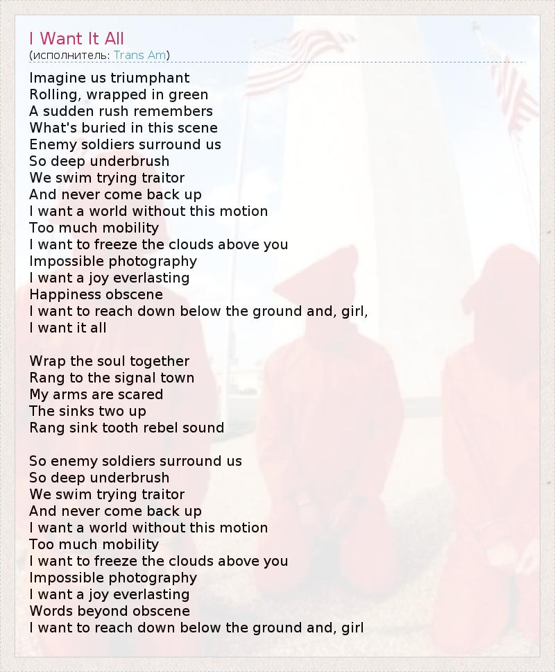 Imagine us triumphant Rolling, wrapped in green A sudden rush remembers What's buried in this scene Enemy soldiers surround us So deep underbrush We swim trying traitor And never come back up I want a world without this motion Too much mobility I want to freeze the clouds above you Impossible photography I want a joy everlasting Happiness obscene I want to reach down below the ground and, girl, I want it all Wrap the soul together Rang to the signal town My arms are scared The sinks two up Rang sink tooth rebel sound So enemy soldiers surround us So deep underbrush We swim trying traitor And never come back up I want a world without this motion Too much mobility I want to freeze the clouds above you Impossible photography I want a joy everlasting Words beyond obscene I want to reach down below the ground and, girl