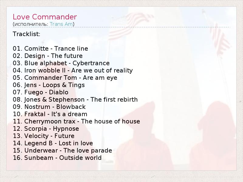 Треклист : 01. КОМИТЕТ - Trance линия 02. -дизайн - будущее 03. Голубой алфавит - Cybertrance 04. Утюг колебание II - Неужели мы из реальности 05. Commander Tom - Являются утра глаз 06. Йенс - Петли и усилителя ; Tings 07. Fuego - Diablo 08. Джонс и усилителя ; Стивенсон - Первый возрождение 09. Nostrum - Отдача 10. Fraktal - Это мечта 11. Cherrymoon Trax - Дом дома 12. Скорпии - Hypnose 13. Velocity - Будущее 14. Легенда B - Затерянный в любви 15. Нижнее белье -любовь парад 16. Sunbeam - Внешний мир
