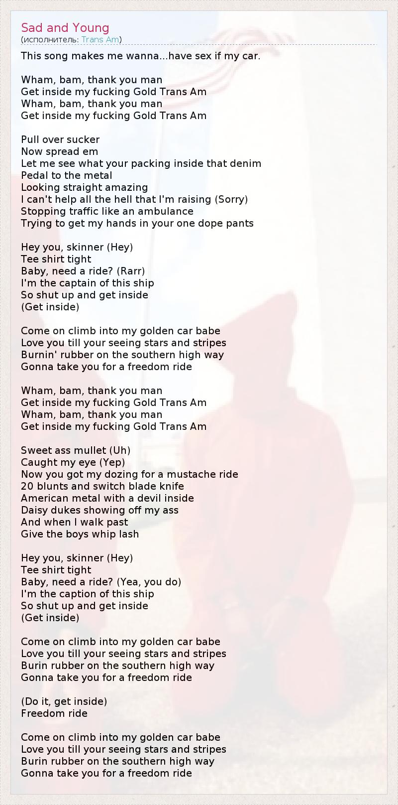 This song makes me wanna...have sex if my car. Wham, bam, thank you man Get inside my fucking Gold Trans Am Wham, bam, thank you man Get inside my fucking Gold Trans Am Pull over sucker Now spread em Let me see what your packing inside that denim Pedal to the metal Looking straight amazing I can't help all the hell that I'm raising (Sorry) Stopping traffic like an ambulance Trying to get my hands in your one dope pants Hey you, skinner (Hey) Tee shirt tight Baby, need a ride? (Rarr) I'm the captain of this ship So shut up and get inside (Get inside) Come on climb into my golden car babe Love you till your seeing stars and stripes Burnin' rubber on the southern high way Gonna take you for a freedom ride Wham, bam, thank you man Get inside my fucking Gold Trans Am Wham, bam, thank you man Get inside my fucking Gold Trans Am Sweet ass mullet (Uh) Caught my eye (Yep) Now you got my dozing for a mustache ride 20 blunts and switch blade knife American metal with a devil inside Daisy dukes showing off my ass And when I walk past Give the boys whip lash Hey you, skinner (Hey) Tee shirt tight Baby, need a ride? (Yea, you do) I'm the caption of this ship So shut up and get inside (Get inside) Come on climb into my golden car babe Love you till your seeing stars and stripes Burin rubber on the southern high way Gonna take you for a freedom ride (Do it, get inside) Freedom ride Come on climb into my golden car babe Love you till your seeing stars and stripes Burin rubber on the southern high way Gonna take you for a freedom ride