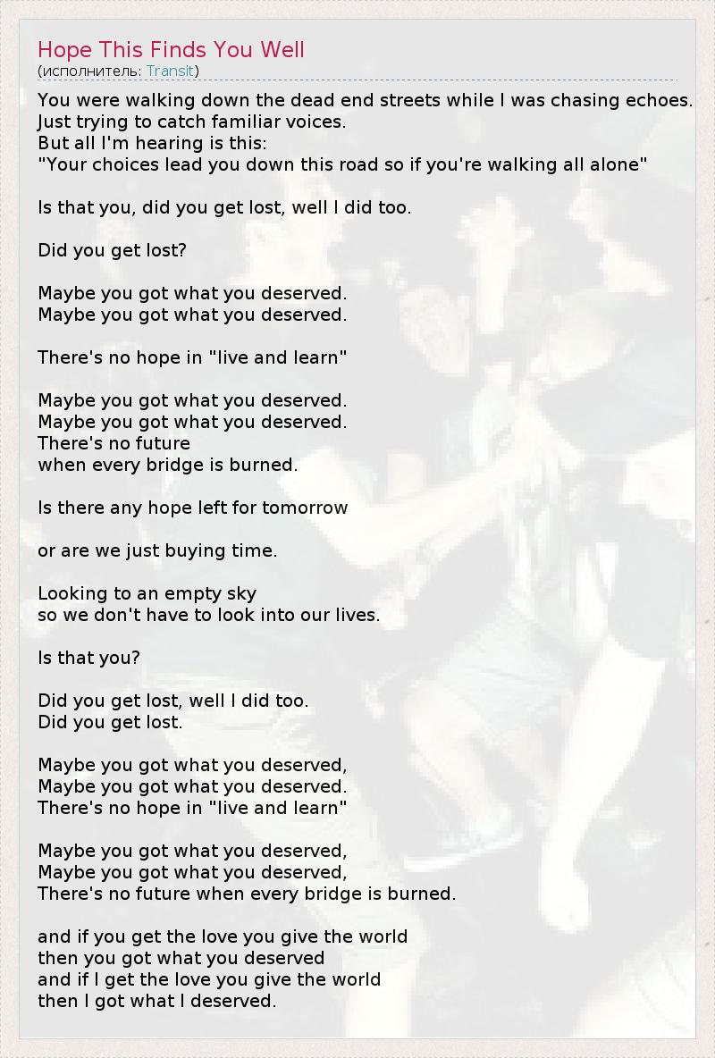 Вы шли в тупик улицы , а я гнался эхо. Просто пытаюсь поймать знакомые голоса . Но все , что я слышу это : и Quot; Ваш выбор приведет вас по этой дороге , так что если вы идете в полном одиночестве и Quot; Это вы, вы заблудились, а я тоже. Разве вы заблудились ? Может быть, вы получили то, что заслужили . Может быть, вы получили то, что заслужили . Там нет никакой надежды на & Quot; жить и учиться и Quot; Может быть, вы получили то, что заслужили . Может быть, вы получили то, что заслужили . Там нет будущего когда каждый мост сожжен. Есть ли надежда на завтра или мы просто тянули время . Глядя на пустой неба таким образом, мы не должны смотреть в нашу жизнь. Это ты? Разве вы заблудились , ну я тоже. Разве вы заблудились . Может быть, вы получили то, что заслужили , Может быть, вы получили то, что заслужили . Там нет никакой надежды на & Quot; жить и учиться и Quot; Может быть, вы получили то, что заслужили , Может быть, вы получили то, что заслужили , Там нет будущего , когда каждый мост сожжен. и если вы получите любовь вы даете миру то вы получили то, что заслужили и если я получаю любовь вы даете миру Затем я получил то, что я заслужил .