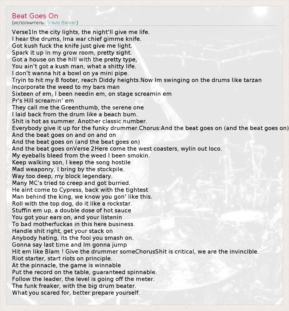 Verse1In the city lights, the night'll give me life. I hear the drums, Ima war chief gimme knife. Got kush fuck the knife just give me light. Spark it up in my grow room, pretty sight. Got a house on the hill with the pretty type, You ain't got a kush man, what a shitty life. I don't wanna hit a bowl on ya mini pipe. Tryin to hit my 8 footer, reach Diddy heights.Now Im swinging on the drums like tarzan Incorporate the weed to my bars man Sixteen of em, I been needin em, on stage screamin em Pr's Hill screamin' em They call me the Greenthumb, the serene one I laid back from the drum like a beach bum. Shit is hot as summer. Another classic number. Everybody give it up for the funky drummer.Chorus:And the beat goes on (and the beat goes on) And the beat goes on and on and on And the beat goes on (and the beat goes on) And the beat goes onVerse 2Here come the west coasters, wylin out loco. My eyeballs bleed from the weed I been smokin. Keep walking son, I keep the song hostile Mad weaponry, I bring by the stockpile. Way too deep, my block legendary. Many MC's tried to creep and got burried. He aint come to Cypress, back with the tightest Man behind the king, we know you gon' like this. Roll with the top dog, do it like a rockstar. Stuffin em up, a double dose of hot sauce You got your ears on, and your listenin To bad motherfuckas in this here business. Handle shit right, get your stack on Anybody hating, its the fool you smash on. Gonna say last time and Im gonna jump Hit em like Blam ! Give the drummer someChorusShit is critical, we are the invincible. Riot starter, start riots on principle. At the pinnacle, the game is winnable Put the record on the table, guaranteed spinnable. Follow the leader, the level is going off the meter. The funk freaker, with the big drum beater. What you scared for, better prepare yourself.