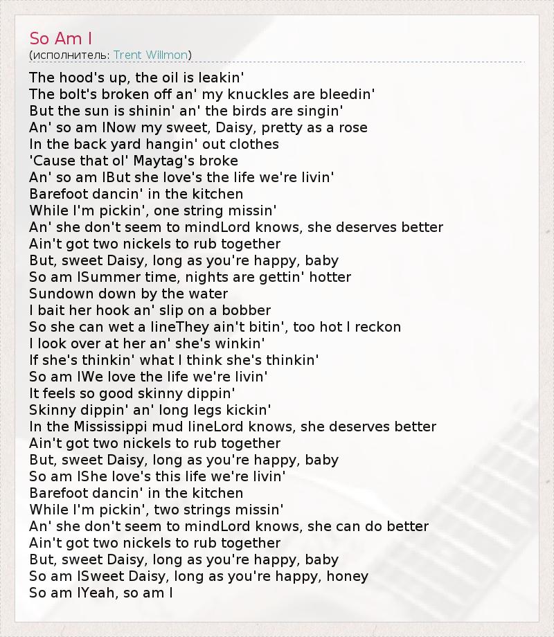 The hood's up, the oil is leakin' The bolt's broken off an' my knuckles are bleedin' But the sun is shinin' an' the birds are singin' An' so am INow my sweet, Daisy, pretty as a rose In the back yard hangin' out clothes 'Cause that ol' Maytag's broke An' so am IBut she love's the life we're livin' Barefoot dancin' in the kitchen While I'm pickin', one string missin' An' she don't seem to mindLord knows, she deserves better Ain't got two nickels to rub together But, sweet Daisy, long as you're happy, baby So am ISummer time, nights are gettin' hotter Sundown down by the water I bait her hook an' slip on a bobber So she can wet a lineThey ain't bitin', too hot I reckon I look over at her an' she's winkin' If she's thinkin' what I think she's thinkin' So am IWe love the life we're livin' It feels so good skinny dippin' Skinny dippin' an' long legs kickin' In the Mississippi mud lineLord knows, she deserves better Ain't got two nickels to rub together But, sweet Daisy, long as you're happy, baby So am IShe love's this life we're livin' Barefoot dancin' in the kitchen While I'm pickin', two strings missin' An' she don't seem to mindLord knows, she can do better Ain't got two nickels to rub together But, sweet Daisy, long as you're happy, baby So am ISweet Daisy, long as you're happy, honey So am IYeah, so am I
