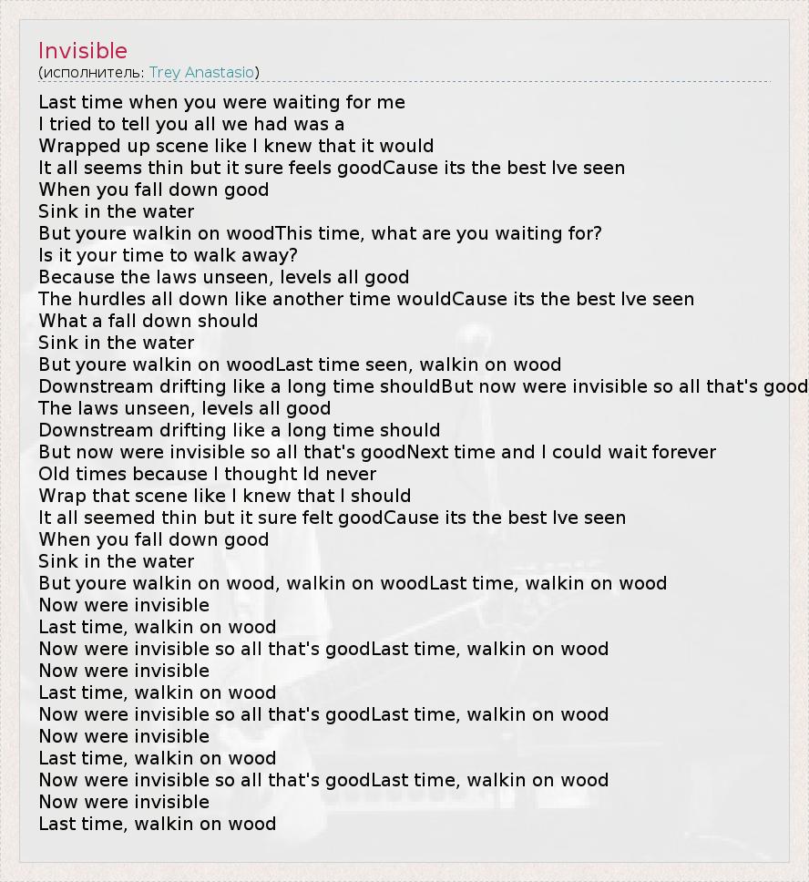 Last time when you were waiting for me I tried to tell you all we had was a Wrapped up scene like I knew that it would It all seems thin but it sure feels goodCause its the best Ive seen When you fall down good Sink in the water But youre walkin on woodThis time, what are you waiting for? Is it your time to walk away? Because the laws unseen, levels all good The hurdles all down like another time wouldCause its the best Ive seen What a fall down should Sink in the water But youre walkin on woodLast time seen, walkin on wood Downstream drifting like a long time shouldBut now were invisible so all that's good The laws unseen, levels all good Downstream drifting like a long time should But now were invisible so all that's goodNext time and I could wait forever Old times because I thought Id never Wrap that scene like I knew that I should It all seemed thin but it sure felt goodCause its the best Ive seen When you fall down good Sink in the water But youre walkin on wood, walkin on woodLast time, walkin on wood Now were invisible Last time, walkin on wood Now were invisible so all that's goodLast time, walkin on wood Now were invisible Last time, walkin on wood Now were invisible so all that's goodLast time, walkin on wood Now were invisible Last time, walkin on wood Now were invisible so all that's goodLast time, walkin on wood Now were invisible Last time, walkin on wood