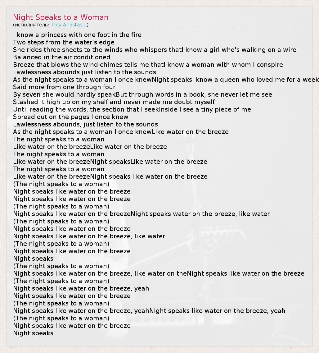 I know a princess with one foot in the fire Two steps from the water's edge She rides three sheets to the winds who whispers thatI know a girl who's walking on a wire Balanced in the air conditioned Breeze that blows the wind chimes tells me thatI know a woman with whom I conspire Lawlessness abounds just listen to the sounds As the night speaks to a woman I once knewNight speaksI know a queen who loved me for a week Said more from one through four By seven she would hardly speakBut through words in a book, she never let me see Stashed it high up on my shelf and never made me doubt myself Until reading the words, the section that I seekInside I see a tiny piece of me Spread out on the pages I once knew Lawlessness abounds, just listen to the sounds As the night speaks to a woman I once knewLike water on the breeze The night speaks to a woman Like water on the breezeLike water on the breeze The night speaks to a woman Like water on the breezeNight speaksLike water on the breeze The night speaks to a woman Like water on the breezeNight speaks like water on the breeze (The night speaks to a woman) Night speaks like water on the breeze Night speaks like water on the breeze (The night speaks to a woman) Night speaks like water on the breezeNight speaks water on the breeze, like water (The night speaks to a woman) Night speaks like water on the breeze Night speaks like water on the breeze, like water (The night speaks to a woman) Night speaks like water on the breeze Night speaks (The night speaks to a woman) Night speaks like water on the breeze, like water on theNight speaks like water on the breeze (The night speaks to a woman) Night speaks like water on the breeze, yeah Night speaks like water on the breeze (The night speaks to a woman) Night speaks like water on the breeze, yeahNight speaks like water on the breeze, yeah (The night speaks to a woman) Night speaks like water on the breeze Night speaks