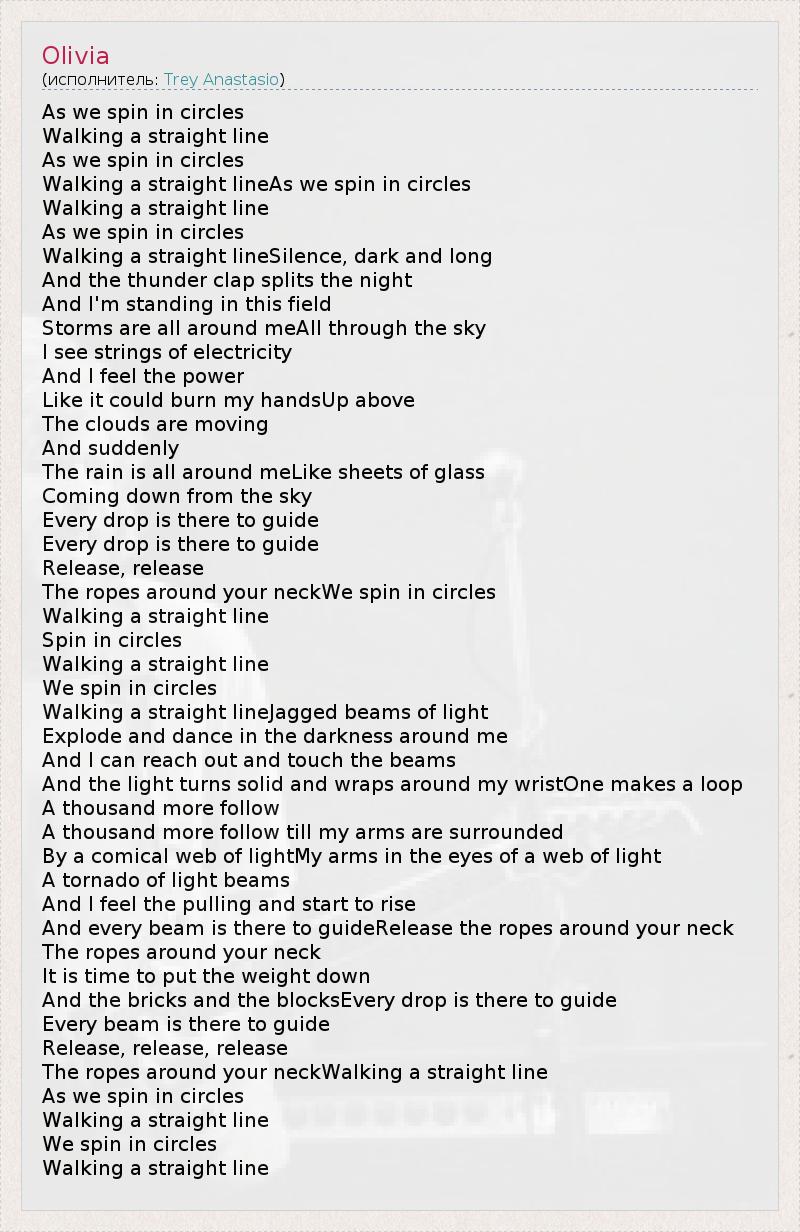 As we spin in circles Walking a straight line As we spin in circles Walking a straight lineAs we spin in circles Walking a straight line As we spin in circles Walking a straight lineSilence, dark and long And the thunder clap splits the night And I'm standing in this field Storms are all around meAll through the sky I see strings of electricity And I feel the power Like it could burn my handsUp above The clouds are moving And suddenly The rain is all around meLike sheets of glass Coming down from the sky Every drop is there to guide Every drop is there to guide Release, release The ropes around your neckWe spin in circles Walking a straight line Spin in circles Walking a straight line We spin in circles Walking a straight lineJagged beams of light Explode and dance in the darkness around me And I can reach out and touch the beams And the light turns solid and wraps around my wristOne makes a loop A thousand more follow A thousand more follow till my arms are surrounded By a comical web of lightMy arms in the eyes of a web of light A tornado of light beams And I feel the pulling and start to rise And every beam is there to guideRelease the ropes around your neck The ropes around your neck It is time to put the weight down And the bricks and the blocksEvery drop is there to guide Every beam is there to guide Release, release, release The ropes around your neckWalking a straight line As we spin in circles Walking a straight line We spin in circles Walking a straight line