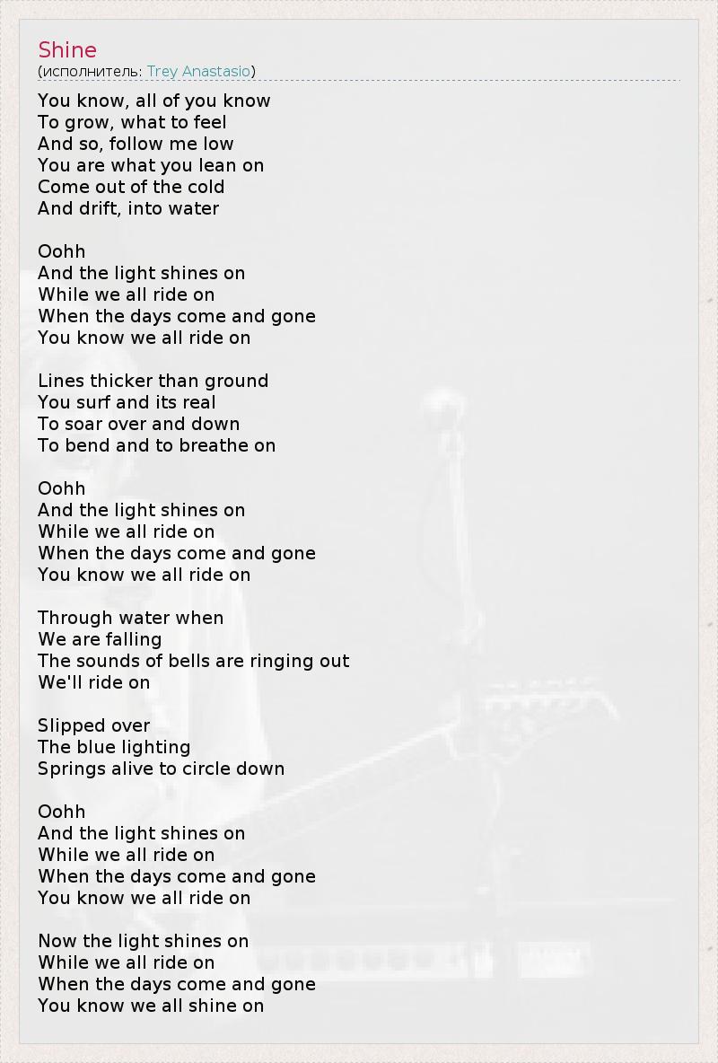 You know, all of you know To grow, what to feel And so, follow me low You are what you lean on Come out of the cold And drift, into water Oohh And the light shines on While we all ride on When the days come and gone You know we all ride on Lines thicker than ground You surf and its real To soar over and down To bend and to breathe on Oohh And the light shines on While we all ride on When the days come and gone You know we all ride on Through water when We are falling The sounds of bells are ringing out We'll ride on Slipped over The blue lighting Springs alive to circle down Oohh And the light shines on While we all ride on When the days come and gone You know we all ride on Now the light shines on While we all ride on When the days come and gone You know we all shine on