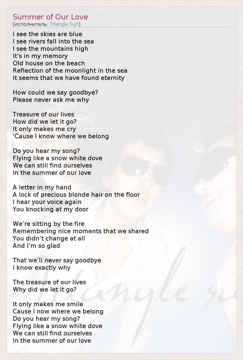 Я вижу голубые небеса, Я вижу, как реки впадают в море, Я вижу высокие горы. Все это в моей памяти. Старый домик на пляже, Отражение луны в море. Казалось, что мы разгадали вечность. Почему же мы расстались? Пожалуйста, не спрашивай меня. Наше счастье… Как получилось, что мы его упустили? Мне хочется плакать, Потому что я знаю, где нам следует быть. Слышишь мою песню? Она парит, как белоснежный голубь. Мы все еще вместе В лето нашей любви. Письмо в моей руке. Локон прекрасных светлых волос на полу. Я снова слышу твой голос. Ты стучишься в мою дверь. Мы сидим у огня, Вспоминая чудесные моменты, что провели вместе. Ты совсем не изменилась, И я очень этому рад. Теперь я знаю, Почему мы никогда не расстанемся. Наше счастье… Как получилось, что мы его упустили? Мне радостно, Потому что я знаю, где нам следует быть. Слышишь мою песню? Она парит, как белоснежный голубь. Мы все еще вместе В лето нашей любви.