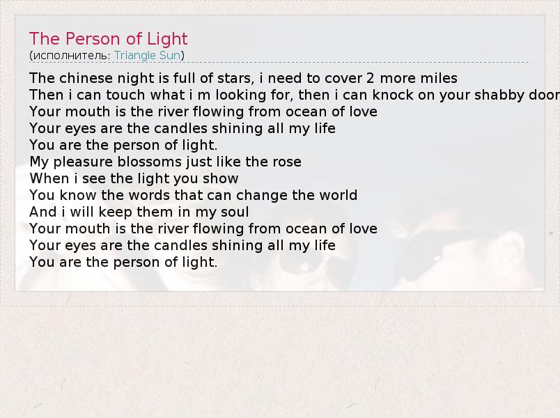 The chinese night is full of stars, i need to cover 2 more miles Then i can touch what i m looking for, then i can knock on your shabby door Your mouth is the river flowing from ocean of love Your eyes are the candles shining all my life You are the person of light. My pleasure blossoms just like the rose When i see the light you show You know the words that can change the world And i will keep them in my soul Your mouth is the river flowing from ocean of love Your eyes are the candles shining all my life You are the person of light.