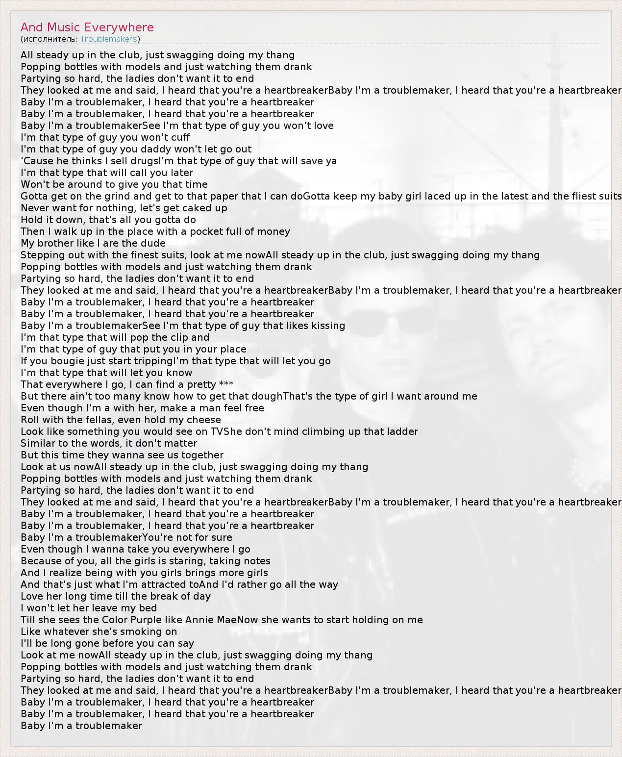 All steady up in the club, just swagging doing my thang Popping bottles with models and just watching them drank Partying so hard, the ladies don't want it to end They looked at me and said, I heard that you're a heartbreakerBaby I'm a troublemaker, I heard that you're a heartbreaker Baby I'm a troublemaker, I heard that you're a heartbreaker Baby I'm a troublemaker, I heard that you're a heartbreaker Baby I'm a troublemakerSee I'm that type of guy you won't love I'm that type of guy you won't cuff I'm that type of guy you daddy won't let go out 'Cause he thinks I sell drugsI'm that type of guy that will save ya I'm that type that will call you later Won't be around to give you that time Gotta get on the grind and get to that paper that I can doGotta keep my baby girl laced up in the latest and the fliest suits Never want for nothing, let's get caked up Hold it down, that's all you gotta do Then I walk up in the place with a pocket full of money My brother like I are the dude Stepping out with the finest suits, look at me nowAll steady up in the club, just swagging doing my thang Popping bottles with models and just watching them drank Partying so hard, the ladies don't want it to end They looked at me and said, I heard that you're a heartbreakerBaby I'm a troublemaker, I heard that you're a heartbreaker Baby I'm a troublemaker, I heard that you're a heartbreaker Baby I'm a troublemaker, I heard that you're a heartbreaker Baby I'm a troublemakerSee I'm that type of guy that likes kissing I'm that type that will pop the clip and I'm that type of guy that put you in your place If you bougie just start trippingI'm that type that will let you go I'm that type that will let you know That everywhere I go, I can find a pretty *** But there ain't too many know how to get that doughThat's the type of girl I want around me Even though I'm a with her, make a man feel free Roll with the fellas, even hold my cheese Look like something you would see on TVShe don't mind climbing up that ladder Similar to the words, it don't matter But this time they wanna see us together Look at us nowAll steady up in the club, just swagging doing my thang Popping bottles with models and just watching them drank Partying so hard, the ladies don't want it to end They looked at me and said, I heard that you're a heartbreakerBaby I'm a troublemaker, I heard that you're a heartbreaker Baby I'm a troublemaker, I heard that you're a heartbreaker Baby I'm a troublemaker, I heard that you're a heartbreaker Baby I'm a troublemakerYou're not for sure Even though I wanna take you everywhere I go Because of you, all the girls is staring, taking notes And I realize being with you girls brings more girls And that's just what I'm attracted toAnd I'd rather go all the way Love her long time till the break of day I won't let her leave my bed Till she sees the Color Purple like Annie MaeNow she wants to start holding on me Like whatever she's smoking on I'll be long gone before you can say Look at me nowAll steady up in the club, just swagging doing my thang Popping bottles with models and just watching them drank Partying so hard, the ladies don't want it to end They looked at me and said, I heard that you're a heartbreakerBaby I'm a troublemaker, I heard that you're a heartbreaker Baby I'm a troublemaker, I heard that you're a heartbreaker Baby I'm a troublemaker, I heard that you're a heartbreaker Baby I'm a troublemaker