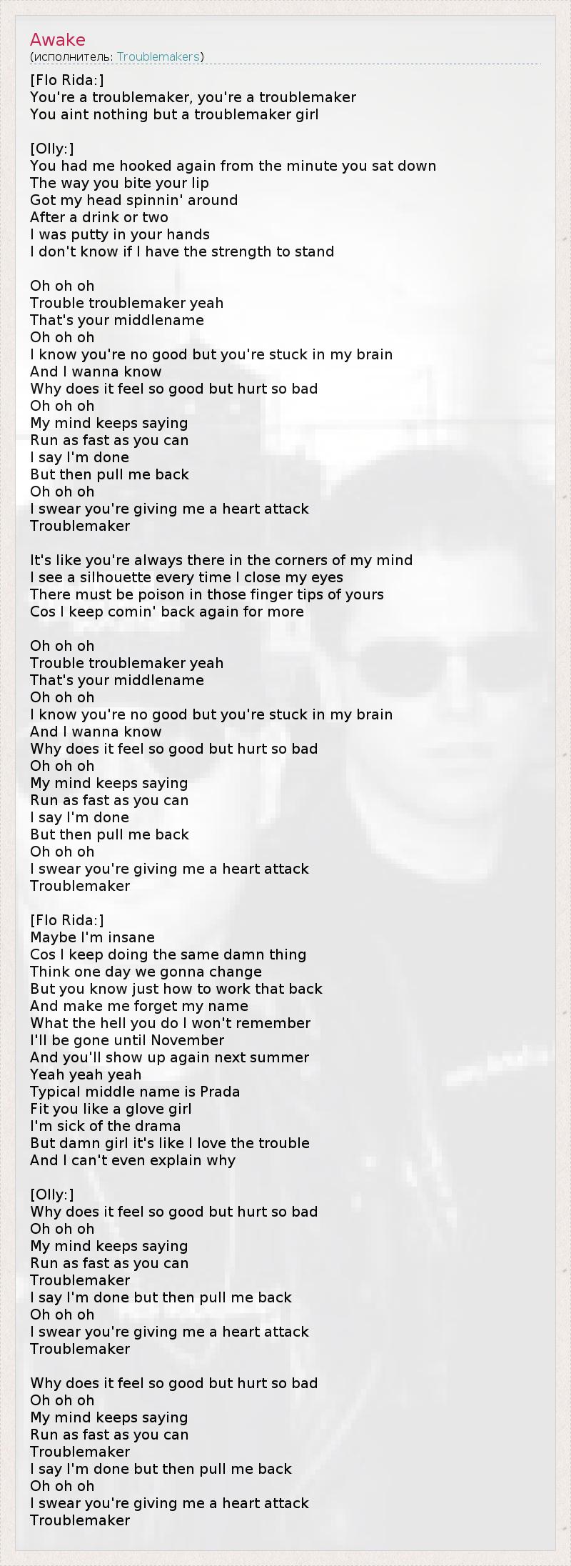 [Flo Rida:] You're a troublemaker, you're a troublemaker You aint nothing but a troublemaker girl [Olly:] You had me hooked again from the minute you sat down The way you bite your lip Got my head spinnin' around After a drink or two I was putty in your hands I don't know if I have the strength to stand Oh oh oh Trouble troublemaker yeah That's your middlename Oh oh oh I know you're no good but you're stuck in my brain And I wanna know Why does it feel so good but hurt so bad Oh oh oh My mind keeps saying Run as fast as you can I say I'm done But then pull me back Oh oh oh I swear you're giving me a heart attack Troublemaker It's like you're always there in the corners of my mind I see a silhouette every time I close my eyes There must be poison in those finger tips of yours Cos I keep comin' back again for more Oh oh oh Trouble troublemaker yeah That's your middlename Oh oh oh I know you're no good but you're stuck in my brain And I wanna know Why does it feel so good but hurt so bad Oh oh oh My mind keeps saying Run as fast as you can I say I'm done But then pull me back Oh oh oh I swear you're giving me a heart attack Troublemaker [Flo Rida:] Maybe I'm insane Cos I keep doing the same damn thing Think one day we gonna change But you know just how to work that back And make me forget my name What the hell you do I won't remember I'll be gone until November And you'll show up again next summer Yeah yeah yeah Typical middle name is Prada Fit you like a glove girl I'm sick of the drama But damn girl it's like I love the trouble And I can't even explain why [Olly:] Why does it feel so good but hurt so bad Oh oh oh My mind keeps saying Run as fast as you can Troublemaker I say I'm done but then pull me back Oh oh oh I swear you're giving me a heart attack Troublemaker Why does it feel so good but hurt so bad Oh oh oh My mind keeps saying Run as fast as you can Troublemaker I say I'm done but then pull me back Oh oh oh I swear you're giving me a heart attack Troublemaker