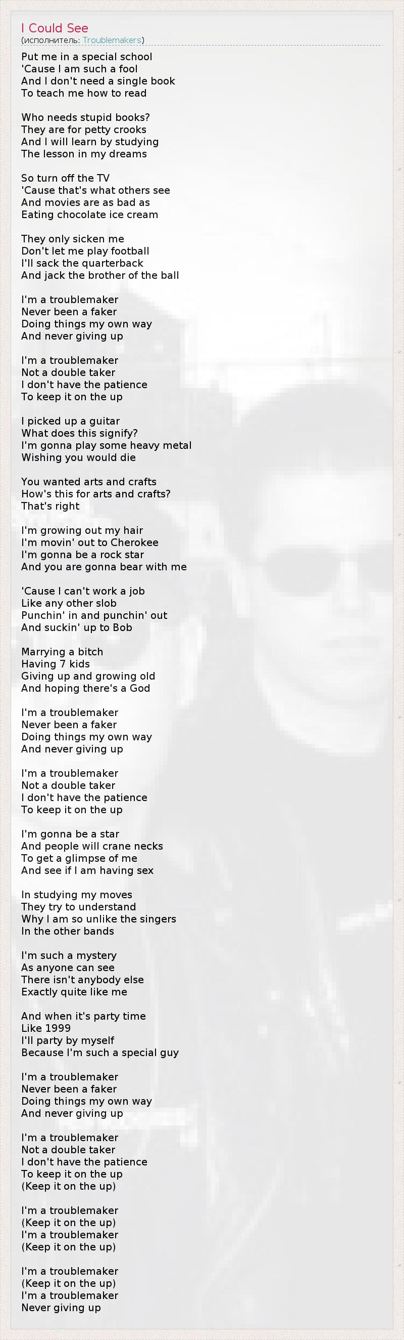 Put me in a special school 'Cause I am such a fool And I don't need a single book To teach me how to read Who needs stupid books? They are for petty crooks And I will learn by studying The lesson in my dreams So turn off the TV 'Cause that's what others see And movies are as bad as Eating chocolate ice cream They only sicken me Don't let me play football I'll sack the quarterback And jack the brother of the ball I'm a troublemaker Never been a faker Doing things my own way And never giving up I'm a troublemaker Not a double taker I don't have the patience To keep it on the up I picked up a guitar What does this signify? I'm gonna play some heavy metal Wishing you would die You wanted arts and crafts How's this for arts and crafts? That's right I'm growing out my hair I'm movin' out to Cherokee I'm gonna be a rock star And you are gonna bear with me 'Cause I can't work a job Like any other slob Punchin' in and punchin' out And suckin' up to Bob Marrying a bitch Having 7 kids Giving up and growing old And hoping there's a God I'm a troublemaker Never been a faker Doing things my own way And never giving up I'm a troublemaker Not a double taker I don't have the patience To keep it on the up I'm gonna be a star And people will crane necks To get a glimpse of me And see if I am having sex In studying my moves They try to understand Why I am so unlike the singers In the other bands I'm such a mystery As anyone can see There isn't anybody else Exactly quite like me And when it's party time Like 1999 I'll party by myself Because I'm such a special guy I'm a troublemaker Never been a faker Doing things my own way And never giving up I'm a troublemaker Not a double taker I don't have the patience To keep it on the up (Keep it on the up) I'm a troublemaker (Keep it on the up) I'm a troublemaker (Keep it on the up) I'm a troublemaker (Keep it on the up) I'm a troublemaker Never giving up