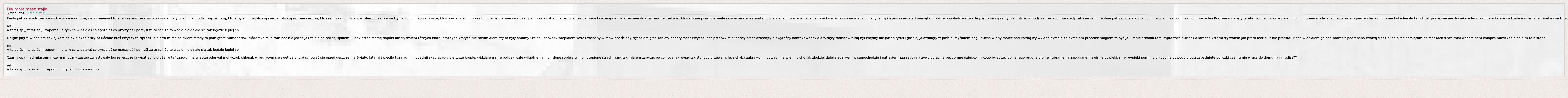 Kiedy patrzę w ich źrenice widzę własne odbicie, wspomnienia które iskrzą jeszcze dziś oczy szklą mały pokój i ja modląc się za ciszą, która była mi najbliższą rzeczą, bliższą niż ona i niż on, bliższą niż dom gdzie wyrosłem, brak pieniędzy i alkohol niszczą proste, ktoś powiedział mi opisz to opisuję nie wierzysz to spytaj moją siostrę ona też wie, też pamięta boazerię na niej czerwień do dziś pewnie czeka aż ktoś kłótnie przerwie wiele razy uciekałem stamtąd uwierz znam to wiem co czuje dziecko myślisz sobie wiedz bo jedyną myślą jest uciec stąd pamiętam późne popołudnie czwarte piętro im wyżej tym smutniej schody zamek kuchnię kiedy tak szedłem nieufnie patrząc czy alkohol cuchnie wiem jak boli i jak puchnie jeden Bóg wie o co były tamte kłótnie, dziś nie pałam do nich gniewem lecz jednego jestem pewien ten dom to nie był eden ilu takich jak ja nie wie nie dociekam lecz jako dziecko nie widziałem w nich człowieka wiedz to.