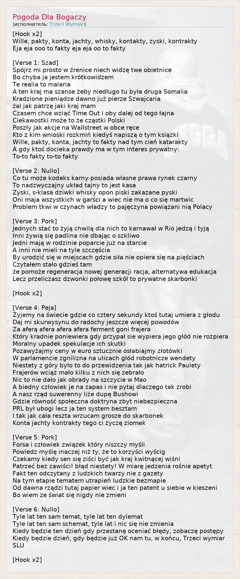 А как ты думаешь, о чем песня "Pogoda Dla Bogaczy" ?