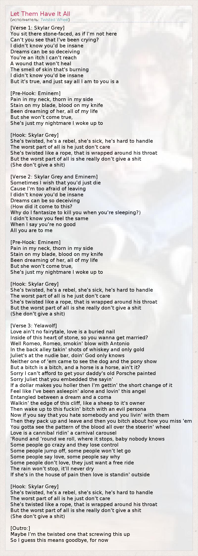 [Verse 1: Skylar Grey] You sit there stone-faced, as if I'm not here Can't you see that I've been crying? I didn't know you'd be insane Dreams can be so deceiving You're an itch I can't reach A wound that won't heal The smell of skin that's burning I didn't know you'd be insane But it's true, and just say all I am to you is a [Pre-Hook: Eminem] Pain in my neck, thorn in my side Stain on my blade, blood on my knife Been dreaming of her, all of my life But she won't come true, She's just my nightmare I woke up to [Hook: Skylar Grey] She's twisted, he's a rebel, she's sick, he's hard to handle The worst part of all is he just don't care She's twisted like a rope, that is wrapped around his throat But the worst part of all is she really don't give a shit (She don't give a shit) [Verse 2: Skylar Grey and Eminem] Sometimes I wish that you'd just die Cause I'm too afraid of leaving I didn't know you'd be insane Dreams can be so deceiving (How did it come to this? Why do I fantasize to kill you when you're sleeping?) I didn't know you feel the same When I say you're no good All you are to me [Pre-Hook: Eminem] Pain in my neck, thorn in my side Stain on my blade, blood on my knife Been dreaming of her, all of my life But she won't come true, She's just my nightmare I woke up to [Hook: Skylar Grey] She's twisted, he's a rebel, she's sick, he's hard to handle The worst part of all is he just don't care She's twisted like a rope, that is wrapped around his throat But the worst part of all is she really don't give a shit (She don't give a shit) [Verse 3: Yelawolf] Love ain't no fairytale, love is a buried nail Inside of this heart of stone, so you wanna get married? Well Romeo, Romeo, smokin' blow with Antonio In the back alley takin' shots of whiskey and only gold Juliet's at the nudie bar, doin' God only knows Neither one of 'em came to see the dog and the pony show But a bitch is a bitch, and a horse is a horse, ain't it? Sorry I can't afford to get your daddy's old Porsche painted Sorry Juliet that you embedded the sayin' If a dollar makes you holler then I'm gettin' the short change of it Feel like I've been asleepin' alone and lovin' this angel Entangled between a dream and a coma Walkin' the edge of this cliff, like a sheep to it's owner Then wake up to this fuckin' bitch with an evil persona Now if you say that you hate somebody and you livin' with them Then they pack up and leave and then you bitch about how you miss 'em You gotta see the pattern of the blood all over the steerin' wheel Love is a cannibal ridin' a carnival carousel 'Round and 'round we roll, where it stops, baby nobody knows Some people go crazy and they lose control Some people jump off, some people won't let go Some people say love, some people say why Some people don't love, they just want a free ride The rain won't stop, it'll never dry If she's in the house of pain then love is standin' outside [Hook: Skylar Grey] She's twisted, he's a rebel, she's sick, he's hard to handle The worst part of all is he just don't care She's twisted like a rope, that is wrapped around his throat But the worst part of all is she really don't give a shit (She don't give a shit) [Outro:] Maybe I'm the twisted one that screwing this up So I guess this means goodbye, for now