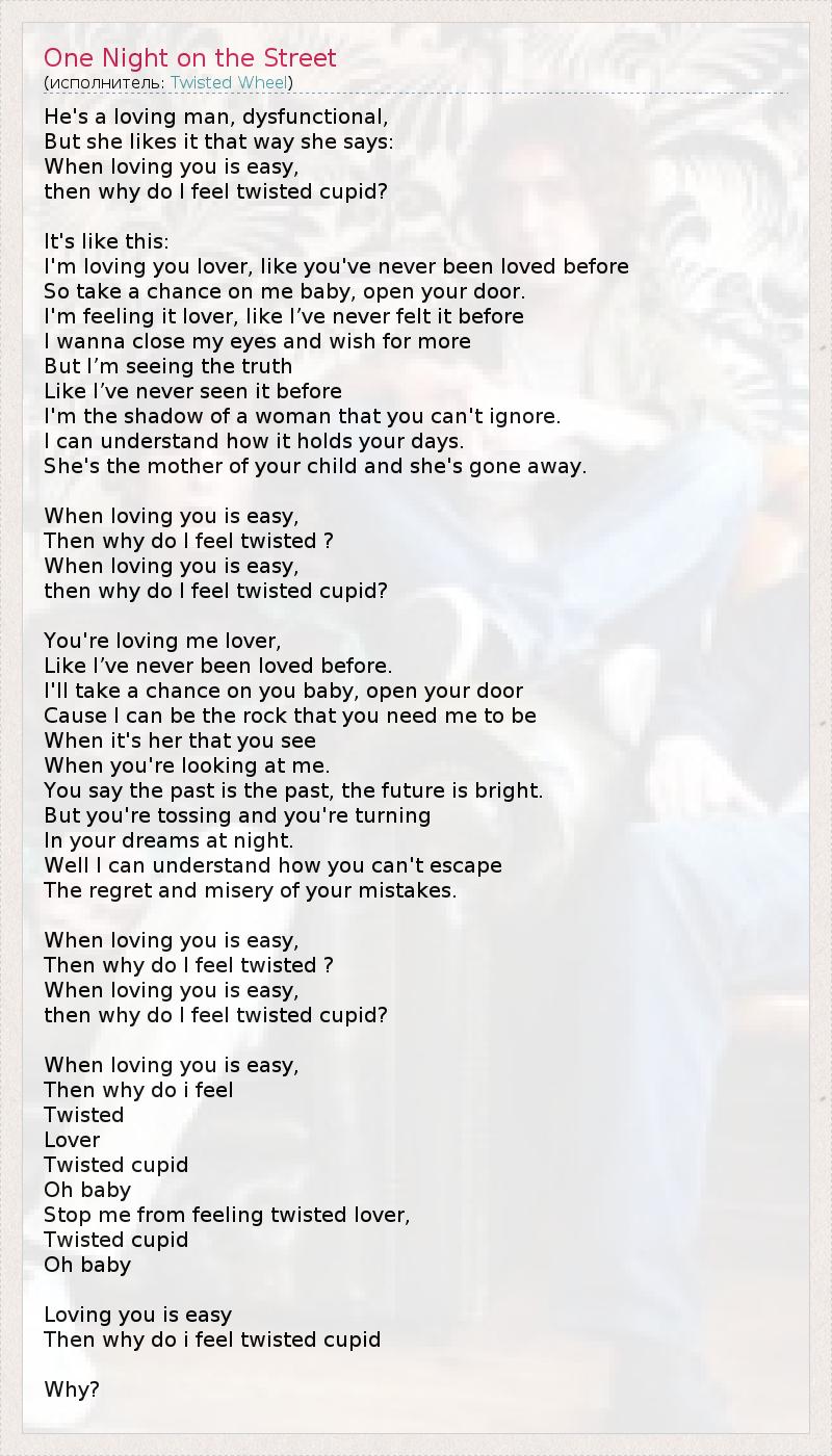 He's a loving man, dysfunctional, But she likes it that way she says: When loving you is easy, then why do I feel twisted cupid? It's like this: I'm loving you lover, like you've never been loved before So take a chance on me baby, open your door. I'm feeling it lover, like I’ve never felt it before I wanna close my eyes and wish for more But I’m seeing the truth Like I’ve never seen it before I'm the shadow of a woman that you can't ignore. I can understand how it holds your days. She's the mother of your child and she's gone away. When loving you is easy, Then why do I feel twisted ? When loving you is easy, then why do I feel twisted cupid? You're loving me lover, Like I’ve never been loved before. I'll take a chance on you baby, open your door Cause I can be the rock that you need me to be When it's her that you see When you're looking at me. You say the past is the past, the future is bright. But you're tossing and you're turning In your dreams at night. Well I can understand how you can't escape The regret and misery of your mistakes. When loving you is easy, Then why do I feel twisted ? When loving you is easy, then why do I feel twisted cupid? When loving you is easy, Then why do i feel Twisted Lover Twisted cupid Oh baby Stop me from feeling twisted lover, Twisted cupid Oh baby Loving you is easy Then why do i feel twisted cupid Why?