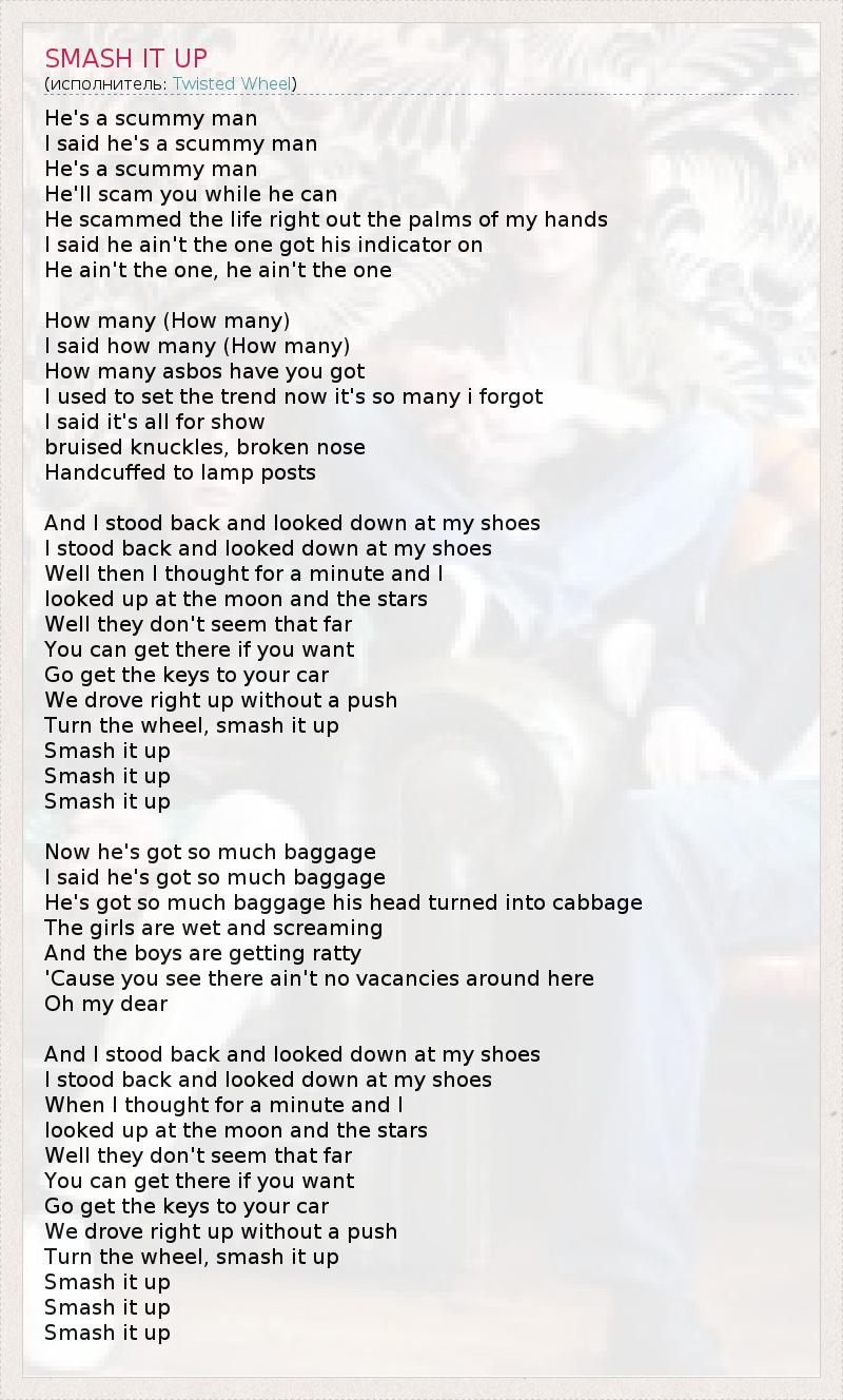 He's a scummy man I said he's a scummy man He's a scummy man He'll scam you while he can He scammed the life right out the palms of my hands I said he ain't the one got his indicator on He ain't the one, he ain't the one How many (How many) I said how many (How many) How many asbos have you got I used to set the trend now it's so many i forgot I said it's all for show bruised knuckles, broken nose Handcuffed to lamp posts And I stood back and looked down at my shoes I stood back and looked down at my shoes Well then I thought for a minute and I looked up at the moon and the stars Well they don't seem that far You can get there if you want Go get the keys to your car We drove right up without a push Turn the wheel, smash it up Smash it up Smash it up Smash it up Now he's got so much baggage I said he's got so much baggage He's got so much baggage his head turned into cabbage The girls are wet and screaming And the boys are getting ratty 'Cause you see there ain't no vacancies around here Oh my dear And I stood back and looked down at my shoes I stood back and looked down at my shoes When I thought for a minute and I looked up at the moon and the stars Well they don't seem that far You can get there if you want Go get the keys to your car We drove right up without a push Turn the wheel, smash it up Smash it up Smash it up Smash it up
