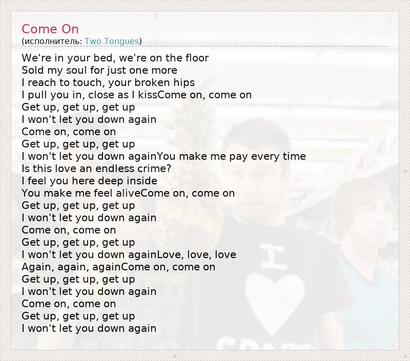 We're in your bed, we're on the floor Sold my soul for just one more I reach to touch, your broken hips I pull you in, close as I kissCome on, come on Get up, get up, get up I won't let you down again Come on, come on Get up, get up, get up I won't let you down againYou make me pay every time Is this love an endless crime? I feel you here deep inside You make me feel aliveCome on, come on Get up, get up, get up I won't let you down again Come on, come on Get up, get up, get up I won't let you down againLove, love, love Again, again, againCome on, come on Get up, get up, get up I won't let you down again Come on, come on Get up, get up, get up I won't let you down again
