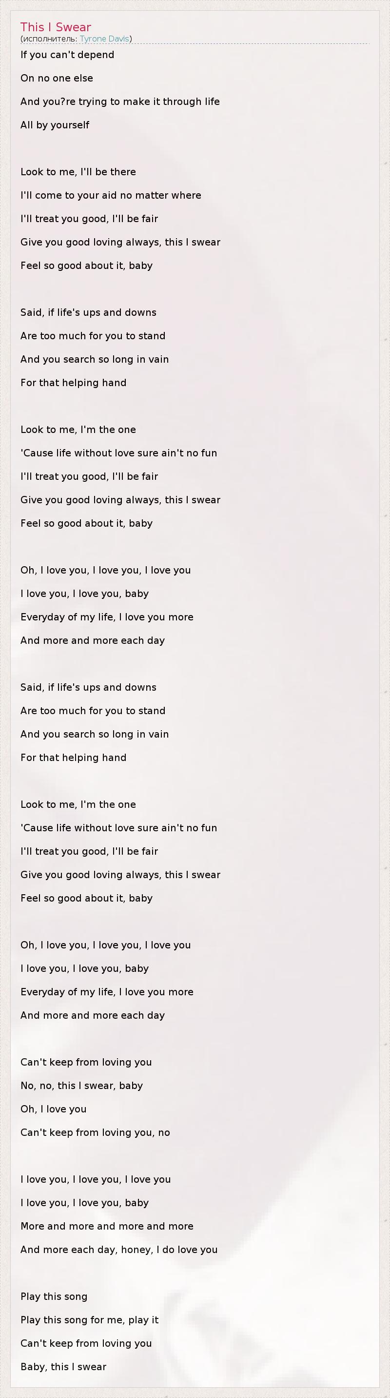 If you can't depend On no one else And you?re trying to make it through life All by yourself Look to me, I'll be there I'll come to your aid no matter where I'll treat you good, I'll be fair Give you good loving always, this I swear Feel so good about it, baby Said, if life's ups and downs Are too much for you to stand And you search so long in vain For that helping hand Look to me, I'm the one 'Cause life without love sure ain't no fun I'll treat you good, I'll be fair Give you good loving always, this I swear Feel so good about it, baby Oh, I love you, I love you, I love you I love you, I love you, baby Everyday of my life, I love you more And more and more each day Said, if life's ups and downs Are too much for you to stand And you search so long in vain For that helping hand Look to me, I'm the one 'Cause life without love sure ain't no fun I'll treat you good, I'll be fair Give you good loving always, this I swear Feel so good about it, baby Oh, I love you, I love you, I love you I love you, I love you, baby Everyday of my life, I love you more And more and more each day Can't keep from loving you No, no, this I swear, baby Oh, I love you Can't keep from loving you, no I love you, I love you, I love you I love you, I love you, baby More and more and more and more And more each day, honey, I do love you Play this song Play this song for me, play it Can't keep from loving you Baby, this I swear