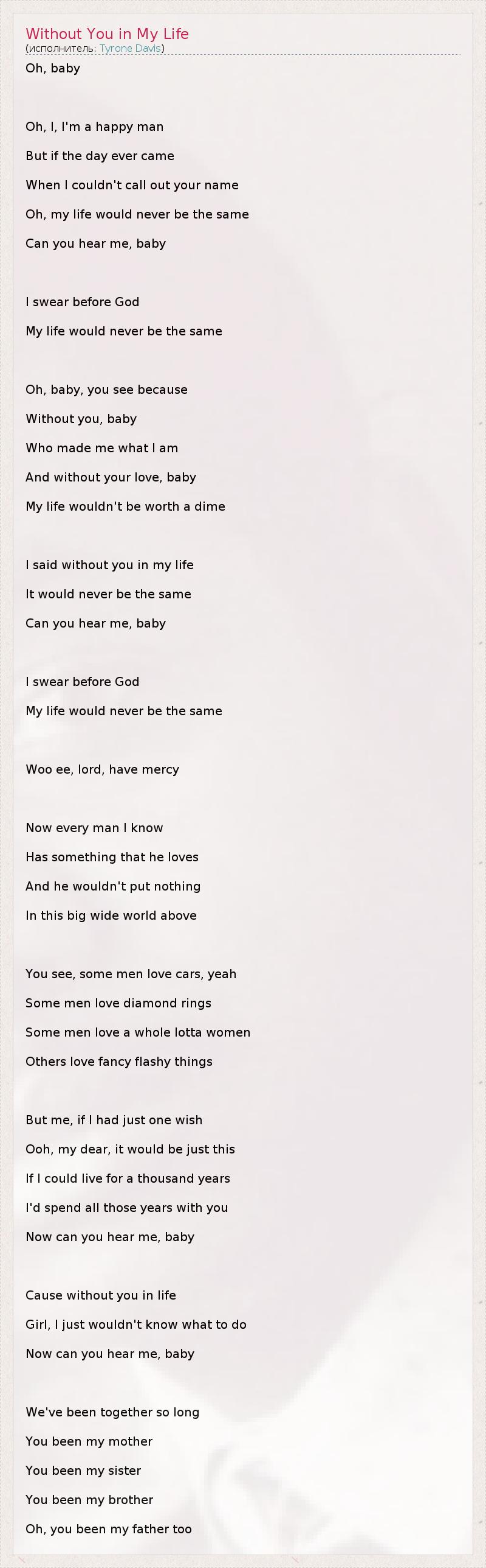 Oh, baby Oh, I, I'm a happy man But if the day ever came When I couldn't call out your name Oh, my life would never be the same Can you hear me, baby I swear before God My life would never be the same Oh, baby, you see because Without you, baby Who made me what I am And without your love, baby My life wouldn't be worth a dime I said without you in my life It would never be the same Can you hear me, baby I swear before God My life would never be the same Woo ee, lord, have mercy Now every man I know Has something that he loves And he wouldn't put nothing In this big wide world above You see, some men love cars, yeah Some men love diamond rings Some men love a whole lotta women Others love fancy flashy things But me, if I had just one wish Ooh, my dear, it would be just this If I could live for a thousand years I'd spend all those years with you Now can you hear me, baby Cause without you in life Girl, I just wouldn't know what to do Now can you hear me, baby We've been together so long You been my mother You been my sister You been my brother Oh, you been my father too