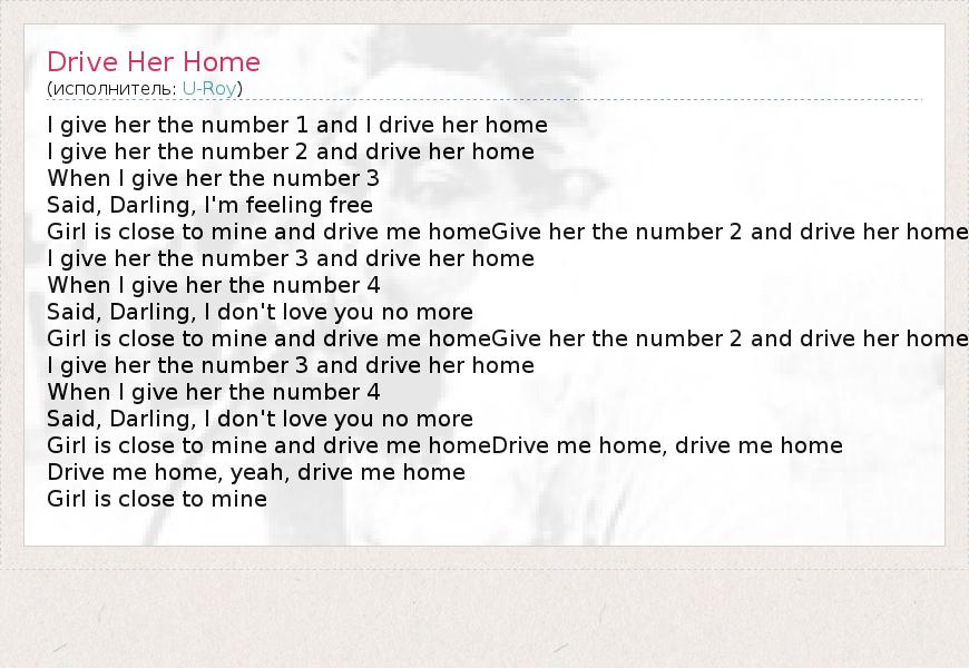I give her the number 1 and I drive her home I give her the number 2 and drive her home When I give her the number 3 Said, Darling, I'm feeling free Girl is close to mine and drive me homeGive her the number 2 and drive her home I give her the number 3 and drive her home When I give her the number 4 Said, Darling, I don't love you no more Girl is close to mine and drive me homeGive her the number 2 and drive her home I give her the number 3 and drive her home When I give her the number 4 Said, Darling, I don't love you no more Girl is close to mine and drive me homeDrive me home, drive me home Drive me home, yeah, drive me home Girl is close to mine