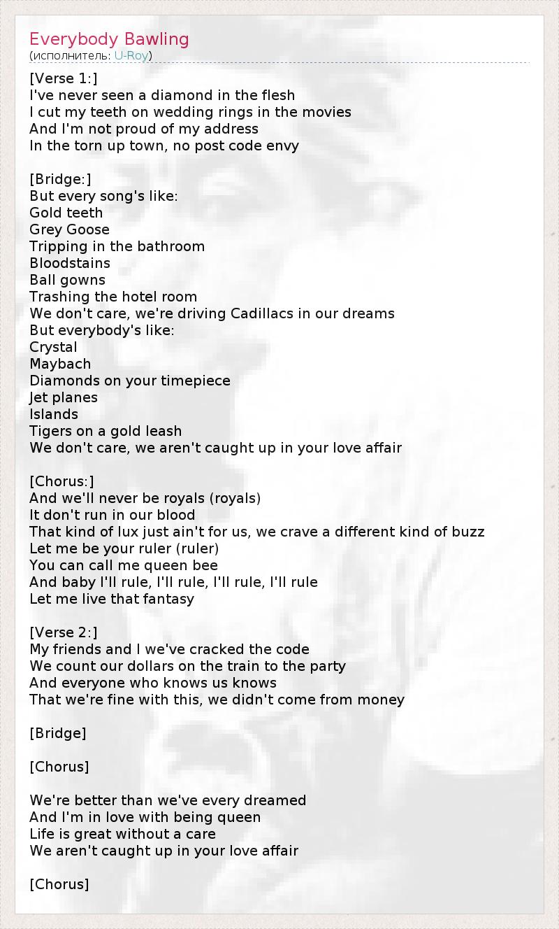 [Verse 1:] I've never seen a diamond in the flesh I cut my teeth on wedding rings in the movies And I'm not proud of my address In the torn up town, no post code envy [Bridge:] But every song's like: Gold teeth Grey Goose Tripping in the bathroom Bloodstains Ball gowns Trashing the hotel room We don't care, we're driving Cadillacs in our dreams But everybody's like: Crystal Maybach Diamonds on your timepiece Jet planes Islands Tigers on a gold leash We don't care, we aren't caught up in your love affair [Chorus:] And we'll never be royals (royals) It don't run in our blood That kind of lux just ain't for us, we crave a different kind of buzz Let me be your ruler (ruler) You can call me queen bee And baby I'll rule, I'll rule, I'll rule, I'll rule Let me live that fantasy [Verse 2:] My friends and I we've cracked the code We count our dollars on the train to the party And everyone who knows us knows That we're fine with this, we didn't come from money [Bridge] [Chorus] We're better than we've every dreamed And I'm in love with being queen Life is great without a care We aren't caught up in your love affair [Chorus]