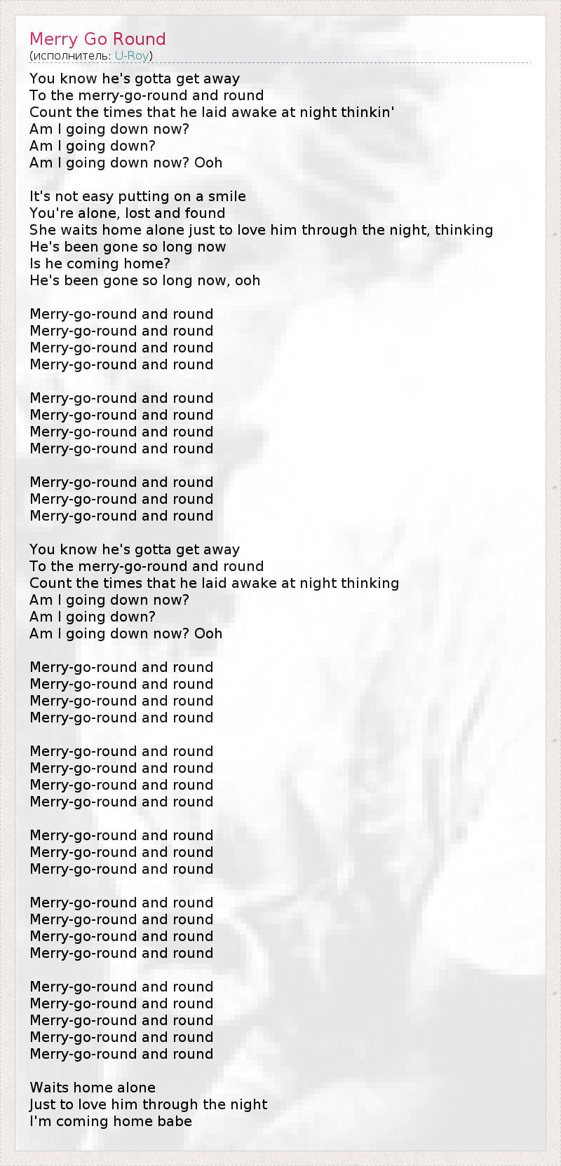 Ты знаешь, он должен выбраться Из замкнутого круга этой карусели Сколько же он положил ночей без сна, думая Иду ли я ко дну? Иду ли я ко дну? Иду ли я ко дну? О Не так просто вешать на лицо улыбку Ты один, теряешься и находишься Она ждет дома одна, чтобы просто любить его всю ночь, думая Он так долго отсутствовал Идет ли он домой? Он так долго отсутствовал, о Словно карусель он ходит по кругу Словно карусель он ходит по кругу Словно карусель он ходит по кругу Словно карусель он ходит по кругу Словно карусель он ходит по кругу Словно карусель он ходит по кругу Словно карусель он ходит по кругу Словно карусель он ходит по кругу Словно карусель он ходит по кругу Словно карусель он ходит по кругу Словно карусель он ходит по кругу Ты знаешь, он должен выбраться Из замкнутого круга этой карусели Сколько же он положил ночей без сна, думая Иду ли я ко дну? Иду ли я ко дну? Иду ли я ко дну? О Словно карусель он ходит по кругу Словно карусель он ходит по кругу Словно карусель он ходит по кругу Словно карусель он ходит по кругу Словно карусель он ходит по кругу Словно карусель он ходит по кругу Словно карусель он ходит по кругу Словно карусель он ходит по кругу Словно карусель он ходит по кругу Словно карусель он ходит по кругу Словно карусель он ходит по кругу Словно карусель он ходит по кругу Словно карусель он ходит по кругу Словно карусель он ходит по кругу Словно карусель он ходит по кругу Словно карусель он ходит по кругу Словно карусель он ходит по кругу Словно карусель он ходит по кругу Словно карусель он ходит по кругу Словно карусель он ходит по кругу Она ждет дома одна Чтобы просто любить его всю ночь Я иду домой, малышка
