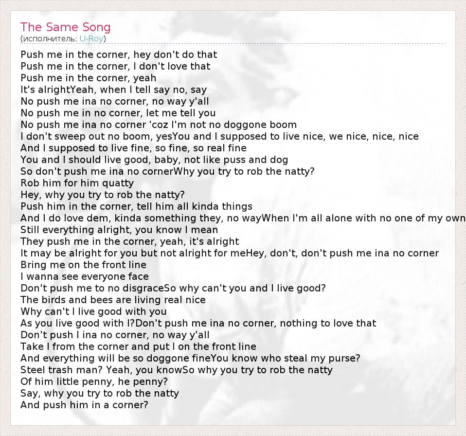 Push me in the corner, hey don't do that Push me in the corner, I don't love that Push me in the corner, yeah It's alrightYeah, when I tell say no, say No push me ina no corner, no way y'all No push me in no corner, let me tell you No push me ina no corner 'coz I'm not no doggone boom I don't sweep out no boom, yesYou and I supposed to live nice, we nice, nice, nice And I supposed to live fine, so fine, so real fine You and I should live good, baby, not like puss and dog So don't push me ina no cornerWhy you try to rob the natty? Rob him for him quatty Hey, why you try to rob the natty? Push him in the corner, tell him all kinda things And I do love dem, kinda something they, no wayWhen I'm all alone with no one of my own Still everything alright, you know I mean They push me in the corner, yeah, it's alright It may be alright for you but not alright for meHey, don't, don't push me ina no corner Bring me on the front line I wanna see everyone face Don't push me to no disgraceSo why can't you and I live good? The birds and bees are living real nice Why can't I live good with you As you live good with I?Don't push me ina no corner, nothing to love that Don't push I ina no corner, no way y'all Take I from the corner and put I on the front line And everything will be so doggone fineYou know who steal my purse? Steel trash man? Yeah, you knowSo why you try to rob the natty Of him little penny, he penny? Say, why you try to rob the natty And push him in a corner?