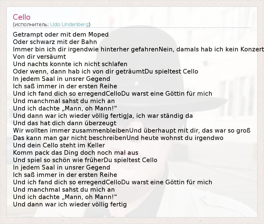 Getrampt oder mit dem Moped Oder schwarz mit der Bahn Immer bin ich dir irgendwie hinterher gefahrenNein, damals hab ich kein Konzert Von dir versäumt Und nachts konnte ich nicht schlafen Oder wenn, dann hab ich von dir geträumtDu spieltest Cello In jedem Saal in unsrer Gegend Ich saß immer in der ersten Reihe Und ich fand dich so erregendCelloDu warst eine Göttin für mich Und manchmal sahst du mich an Und ich dachte „Mann, oh Mann!" Und dann war ich wieder völlig fertigJa, ich war ständig da Und das hat dich dann überzeugt Wir wollten immer zusammenbleibenUnd überhaupt mit dir, das war so groß Das kann man gar nicht beschreibenUnd heute wohnst du irgendwo Und dein Cello steht im Keller Komm pack das Ding doch noch mal aus Und spiel so schön wie früherDu spieltest Cello In jedem Saal in unsrer Gegend Ich saß immer in der ersten Reihe Und ich fand dich so erregendCelloDu warst eine Göttin für mich Und manchmal sahst du mich an Und ich dachte „Mann, oh Mann!" Und dann war ich wieder völlig fertig
