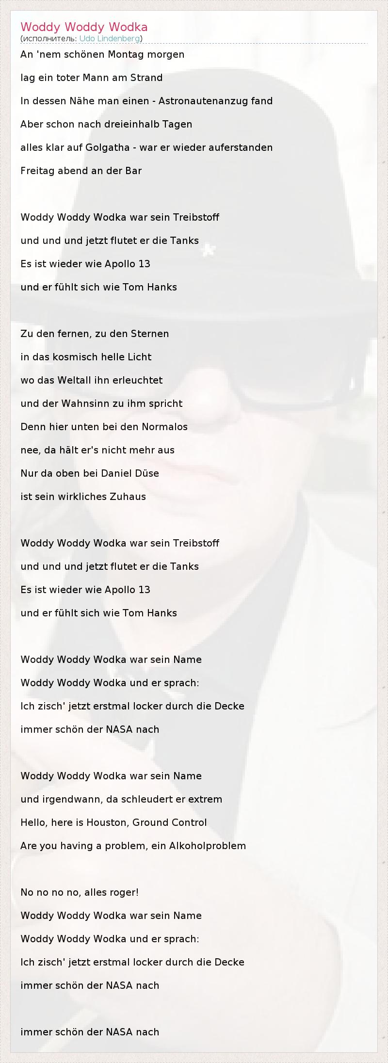 An 'nem schönen Montag morgen lag ein toter Mann am Strand In dessen Nähe man einen - Astronautenanzug fand Aber schon nach dreieinhalb Tagen alles klar auf Golgatha - war er wieder auferstanden Freitag abend an der Bar Woddy Woddy Wodka war sein Treibstoff und und und jetzt flutet er die Tanks Es ist wieder wie Apollo 13 und er fühlt sich wie Tom Hanks Zu den fernen, zu den Sternen in das kosmisch helle Licht wo das Weltall ihn erleuchtet und der Wahnsinn zu ihm spricht Denn hier unten bei den Normalos nee, da hält er's nicht mehr aus Nur da oben bei Daniel Düse ist sein wirkliches Zuhaus Woddy Woddy Wodka war sein Treibstoff und und und jetzt flutet er die Tanks Es ist wieder wie Apollo 13 und er fühlt sich wie Tom Hanks Woddy Woddy Wodka war sein Name Woddy Woddy Wodka und er sprach: Ich zisch' jetzt erstmal locker durch die Decke immer schön der NASA nach Woddy Woddy Wodka war sein Name und irgendwann, da schleudert er extrem Hello, here is Houston, Ground Control Are you having a problem, ein Alkoholproblem No no no no, alles roger! Woddy Woddy Wodka war sein Name Woddy Woddy Wodka und er sprach: Ich zisch' jetzt erstmal locker durch die Decke immer schön der NASA nach immer schön der NASA nach