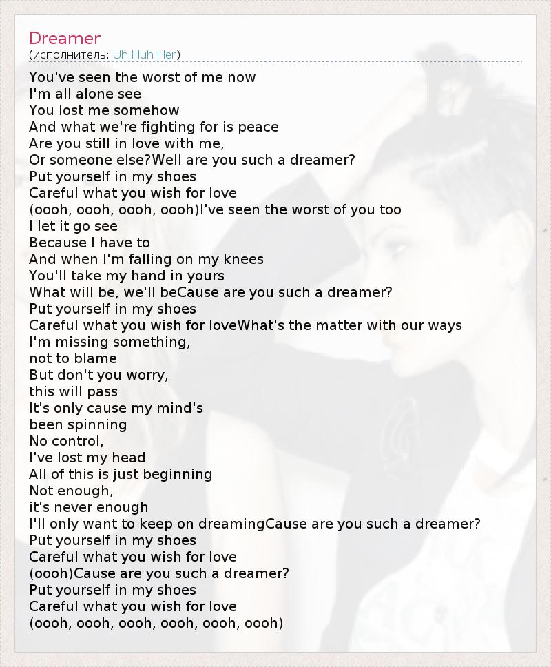 You've seen the worst of me now I'm all alone see You lost me somehow And what we're fighting for is peace Are you still in love with me, Or someone else?Well are you such a dreamer? Put yourself in my shoes Careful what you wish for love (oooh, oooh, oooh, oooh)I've seen the worst of you too I let it go see Because I have to And when I'm falling on my knees You'll take my hand in yours What will be, we'll beCause are you such a dreamer? Put yourself in my shoes Careful what you wish for loveWhat's the matter with our ways I'm missing something, not to blame But don't you worry, this will pass It's only cause my mind's been spinning No control, I've lost my head All of this is just beginning Not enough, it's never enough I'll only want to keep on dreamingCause are you such a dreamer? Put yourself in my shoes Careful what you wish for love (oooh)Cause are you such a dreamer? Put yourself in my shoes Careful what you wish for love (oooh, oooh, oooh, oooh, oooh, oooh)