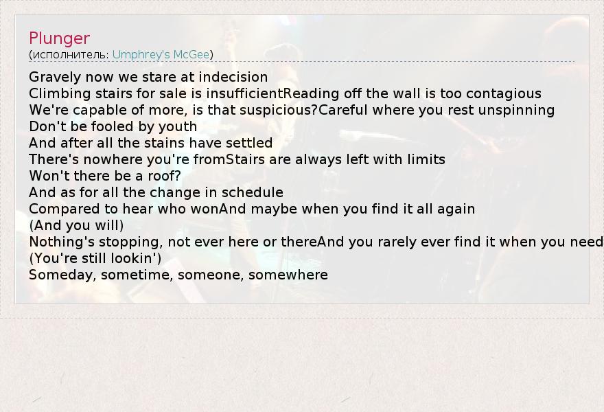 Это интересно:Umphrey's McGee is an American progressive rock band originally from South Bend, Indiana, whose music is often referred to as "progressive improvisation", or "improg". Although the band is part of the jam band scene, like Phish and the Grateful Dead (with ever-changing setlists, improvisation, two sets per night, open taping policy, etc.), they are much more influenced musically by progressive rock artists such as King Crimson, Yes, Pink Floyd, Frank Zappa, The Mahavishnu Orchestra, and early Genesis, as well as heavy metal bands such as Iron Maiden and Guns N' Roses. The band also identifies The Police, The Beatles, and Led Zeppelin as primary influences. UM experiments... продолжение