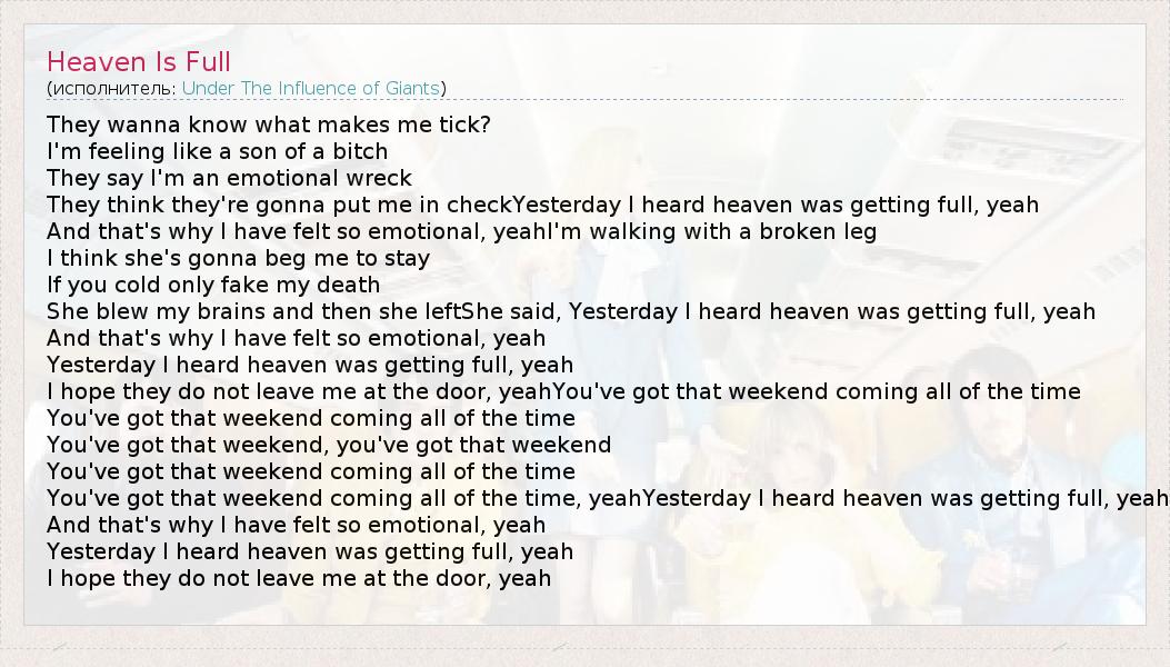 They wanna know what makes me tick? I'm feeling like a son of a bitch They say I'm an emotional wreck They think they're gonna put me in checkYesterday I heard heaven was getting full, yeah And that's why I have felt so emotional, yeahI'm walking with a broken leg I think she's gonna beg me to stay If you cold only fake my death She blew my brains and then she leftShe said, Yesterday I heard heaven was getting full, yeah And that's why I have felt so emotional, yeah Yesterday I heard heaven was getting full, yeah I hope they do not leave me at the door, yeahYou've got that weekend coming all of the time You've got that weekend coming all of the time You've got that weekend, you've got that weekend You've got that weekend coming all of the time You've got that weekend coming all of the time, yeahYesterday I heard heaven was getting full, yeah And that's why I have felt so emotional, yeah Yesterday I heard heaven was getting full, yeah I hope they do not leave me at the door, yeah