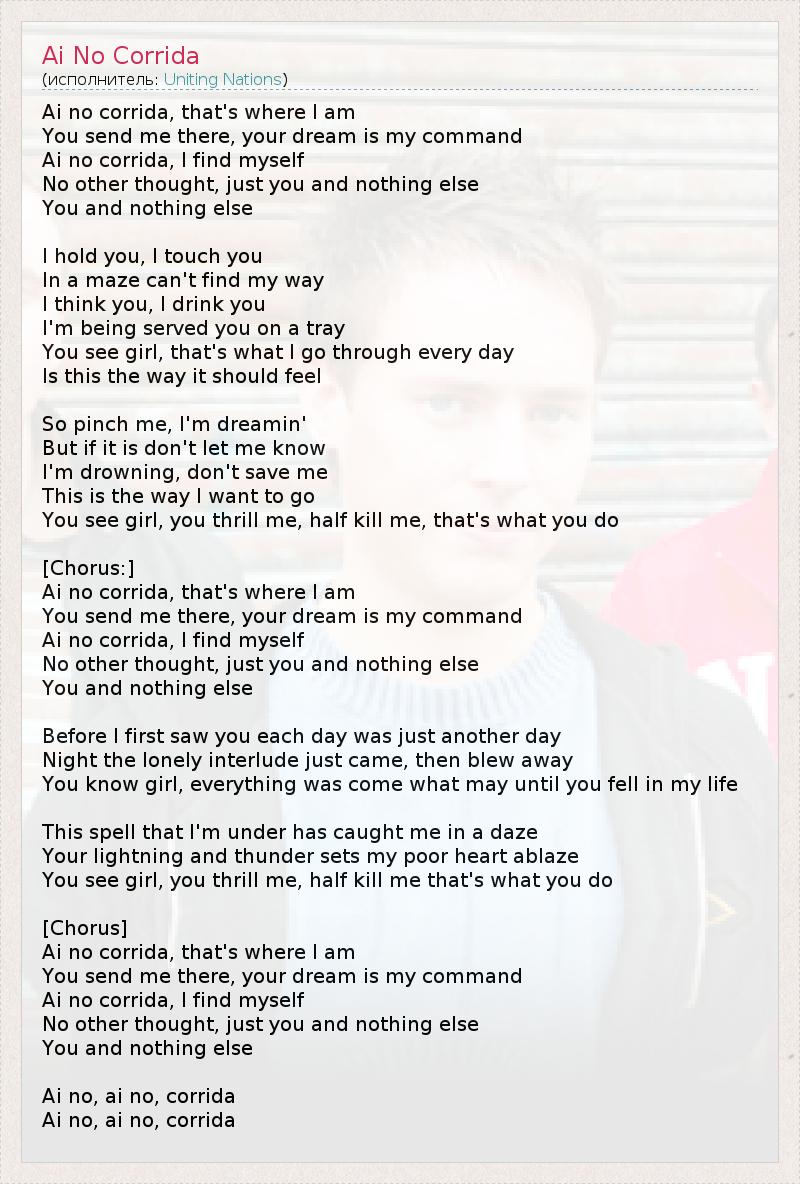 Ai no corrida, that's where I am You send me there, your dream is my command Ai no corrida, I find myself No other thought, just you and nothing else You and nothing else I hold you, I touch you In a maze can't find my way I think you, I drink you I'm being served you on a tray You see girl, that's what I go through every day Is this the way it should feel So pinch me, I'm dreamin' But if it is don't let me know I'm drowning, don't save me This is the way I want to go You see girl, you thrill me, half kill me, that's what you do [Chorus:] Ai no corrida, that's where I am You send me there, your dream is my command Ai no corrida, I find myself No other thought, just you and nothing else You and nothing else Before I first saw you each day was just another day Night the lonely interlude just came, then blew away You know girl, everything was come what may until you fell in my life This spell that I'm under has caught me in a daze Your lightning and thunder sets my poor heart ablaze You see girl, you thrill me, half kill me that's what you do [Chorus] Ai no corrida, that's where I am You send me there, your dream is my command Ai no corrida, I find myself No other thought, just you and nothing else You and nothing else Ai no, ai no, corrida Ai no, ai no, corrida