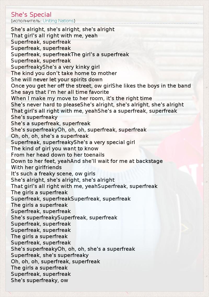 She's alright, she's alright, she's alright That girl's all right with me, yeah Superfreak, superfreak Superfreak, superfreak Superfreak, superfreakThe girl's a superfreak Superfreak, superfreak SuperfreakyShe's a very kinky girl The kind you don't take home to mother She will never let your spirits down Once you get her off the street, ow girlShe likes the boys in the band She says that I'm her all time favorite When I make my move to her room, it's the right time She's never hard to pleaseShe's alright, she's alright, she's alright That girl's all right with me, yeahShe's a superfreak, superfreak She's superfreaky She's a superfreak, superfreak She's superfreakyOh, oh, oh, superfreak, superfreak Oh, oh, oh, she's a superfreak Superfreak, superfreakyShe's a very special girl The kind of girl you want to know From her head down to her toenails Down to her feet, yeahAnd she'll wait for me at backstage With her girlfriends It's such a freaky scene, ow girls She's alright, she's alright, she's alright That girl's all right with me, yeahSuperfreak, superfreak The girls a superfreak Superfreak, superfreakSuperfreak, superfreak The girls a superfreak Superfreak, superfreak She's superfreakySuperfreak, superfreak Superfreak, superfreak Superfreak, superfreak The girls a superfreak Superfreak, superfreak She's superfreakyOh, oh, oh, she's a superfreak Superfreak, she's superfreaky Oh, oh, oh, superfreak, superfreak The girls a superfreak Superfreak, superfreak She's superfreaky, ow