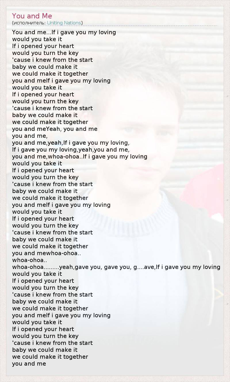 You and me...If i gave you my loving would you take it If i opened your heart would you turn the key 'cause i knew from the start baby we could make it we could make it together you and meIf i gave you my loving would you take it If i opened your heart would you turn the key 'cause i knew from the start baby we could make it we could make it together you and meYeah, you and me you and me, you and me,yeah,If i gave you my loving, If i gave you my loving,yeah,you and me, you and me,whoa-ohoa..If i gave you my loving would you take it If i opened your heart would you turn the key 'cause i knew from the start baby we could make it we could make it together you and meIf i gave you my loving would you take it If i opened your heart would you turn the key 'cause i knew from the start baby we could make it we could make it together you and mewhoa-ohoa.. whoa-ohoa.. whoa-ohoa.........yeah,gave you, gave you, g....ave,If i gave you my loving would you take it If i opened your heart would you turn the key 'cause i knew from the start baby we could make it we could make it together you and meIf i gave you my loving would you take it If i opened your heart would you turn the key 'cause i knew from the start baby we could make it we could make it together you and me