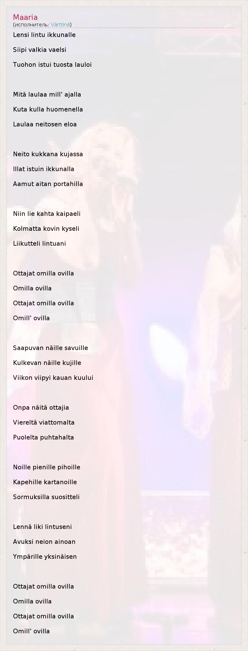 Lensi lintu ikkunalle Siipi valkia vaelsi Tuohon istui tuosta lauloi Mitä laulaa mill' ajalla Kuta kulla huomenella Laulaa neitosen eloa Neito kukkana kujassa Illat istuin ikkunalla Aamut aitan portahilla Niin lie kahta kaipaeli Kolmatta kovin kyseli Liikutteli lintuani Ottajat omilla ovilla Omilla ovilla Ottajat omilla ovilla Omill' ovilla Saapuvan näille savuille Kulkevan näille kujille Viikon viipyi kauan kuului Onpa näitä ottajia Viereltä viattomalta Puolelta puhtahalta Noille pienille pihoille Kapehille kartanoille Sormuksilla suositteli Lennä liki lintuseni Avuksi neion ainoan Ympärille yksinäisen Ottajat omilla ovilla Omilla ovilla Ottajat omilla ovilla Omill' ovilla