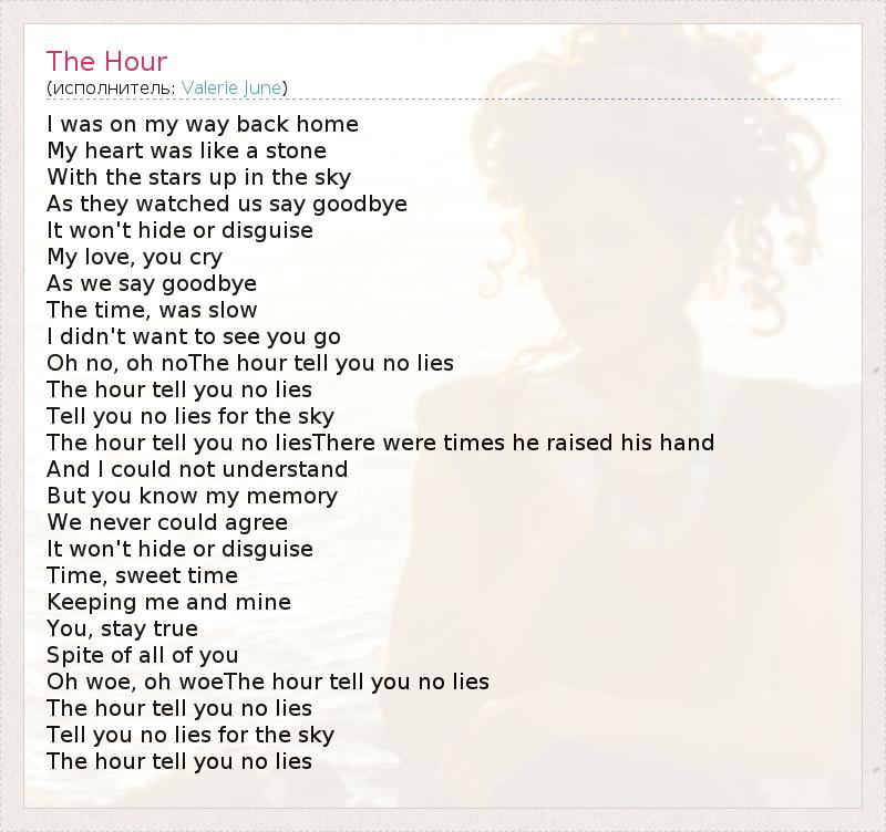 I was on my way back home My heart was like a stone With the stars up in the sky As they watched us say goodbye It won't hide or disguise My love, you cry As we say goodbye The time, was slow I didn't want to see you go Oh no, oh noThe hour tell you no lies The hour tell you no lies Tell you no lies for the sky The hour tell you no liesThere were times he raised his hand And I could not understand But you know my memory We never could agree It won't hide or disguise Time, sweet time Keeping me and mine You, stay true Spite of all of you Oh woe, oh woeThe hour tell you no lies The hour tell you no lies Tell you no lies for the sky The hour tell you no lies