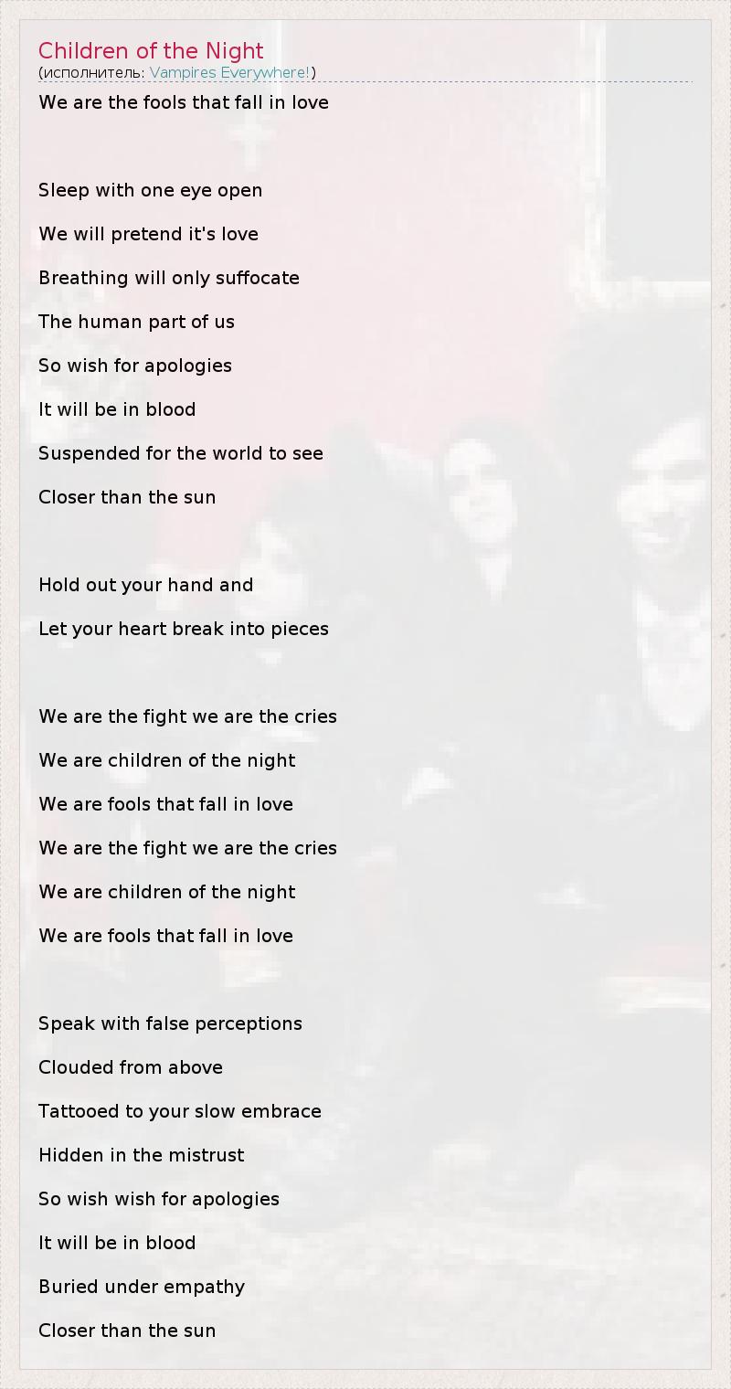 We are the fools that fall in love Sleep with one eye open We will pretend it's love Breathing will only suffocate The human part of us So wish for apologies It will be in blood Suspended for the world to see Closer than the sun Hold out your hand and Let your heart break into pieces We are the fight we are the cries We are children of the night We are fools that fall in love We are the fight we are the cries We are children of the night We are fools that fall in love Speak with false perceptions Clouded from above Tattooed to your slow embrace Hidden in the mistrust So wish wish for apologies It will be in blood Buried under empathy Closer than the sun