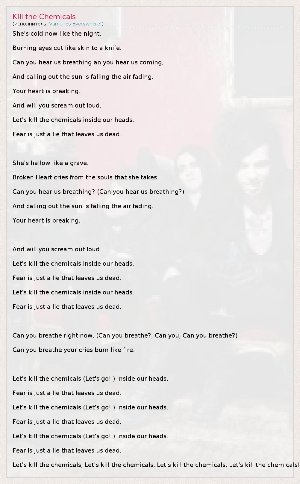 She's cold now like the night. Burning eyes cut like skin to a knife. Can you hear us breathing an you hear us coming, And calling out the sun is falling the air fading. Your heart is breaking. And will you scream out loud. Let's kill the chemicals inside our heads. Fear is just a lie that leaves us dead. She's hallow like a grave. Broken Heart cries from the souls that she takes. Can you hear us breathing? (Can you hear us breathing?) And calling out the sun is falling the air fading. Your heart is breaking. And will you scream out loud. Let's kill the chemicals inside our heads. Fear is just a lie that leaves us dead. Let's kill the chemicals inside our heads. Fear is just a lie that leaves us dead. Can you breathe right now. (Can you breathe?, Can you, Can you breathe?) Can you breathe your cries burn like fire. Let's kill the chemicals (Let's go! ) inside our heads. Fear is just a lie that leaves us dead. Let's kill the chemicals (Let's go! ) inside our heads. Fear is just a lie that leaves us dead. Let's kill the chemicals (Let's go! ) inside our heads. Fear is just a lie that leaves us dead. Let's kill the chemicals, Let's kill the chemicals, Let's kill the chemicals, Let's kill the chemicals!