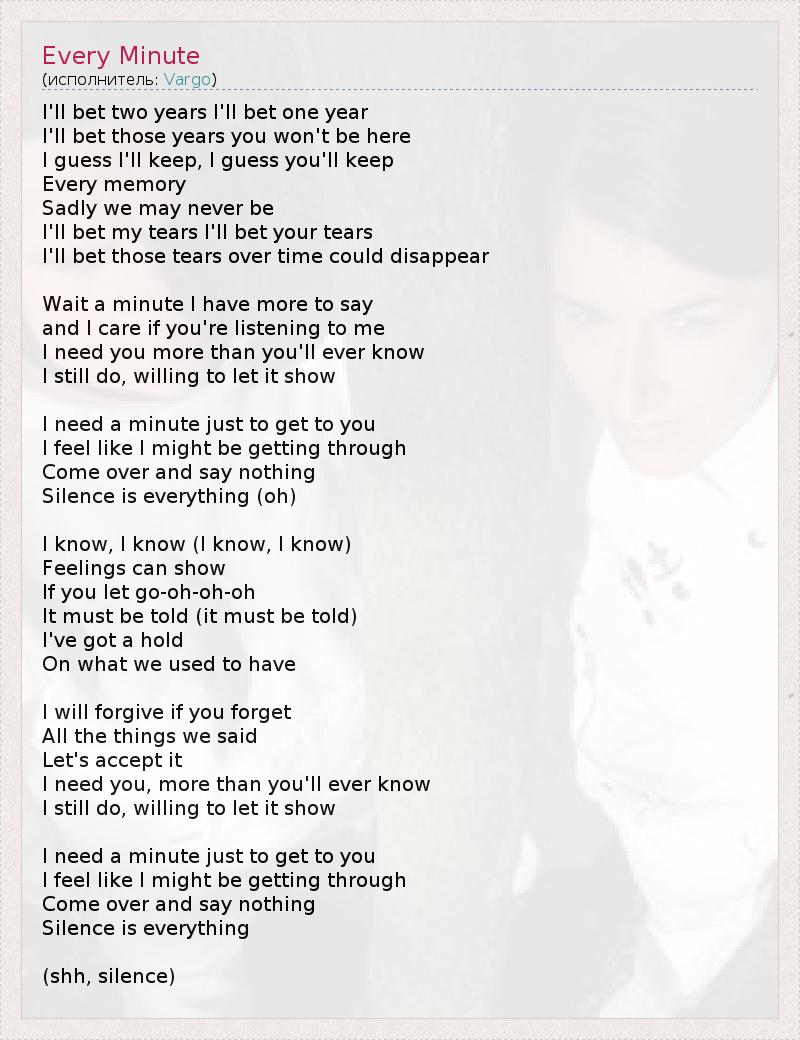 Бьюсь об заклад, спорю на что хочешь, Голову даю на отсечение, что ты уйдёшь... Но, думаю, что сохраню, и надеюсь, что и ты сохранишь Каждое воспоминание... К сожалению, мы никогда не будем вместе... Держу пари, что мои и твои слёзы, Держу пари, что наши слёзы со временем высохнут... Подожди минутку, я хочу ещё кое-что сказать, И мне важно, чтобы ты меня выслушал. Я нуждаюсь в тебе больше, чем кто бы то ни было, Ты всё ещё нужен мне, и я стараюсь показать тебе это. Мне нужна лишь минута, чтобы достучаться до тебя, И я чувствую, что могла бы это сделать. Ты приди, но ничего не говори - Тишина многое значит (oуу) Я знаю, я знаю (я знаю, я знаю), Что чувства кажутся сильнее При расставании. Считаю нужным сказать (это нужно сказать), Что буду тосковать, По тому, что у нас было... Я прощу, если ты забудешь Все вещи, что мы друг другу наговорили. Давай просто примем это. Я нуждаюсь в тебе больше, чем кто бы то ни было, Ты всё ещё нужен мне, и я стараюсь показать тебе это. Мне нужна лишь минута, чтобы достучаться до тебя, И я чувствую, что могла бы это сделать. Ты приди, но ничего не говори - Тишина многое значит... (шшш, тишина)