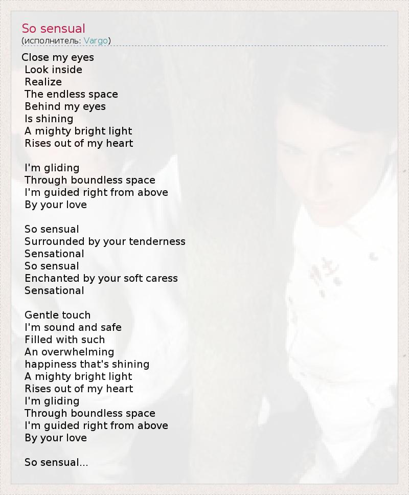 Close my eyes Look inside Realize The endless space Behind my eyes Is shining A mighty bright light Rises out of my heart I'm gliding Through boundless space I'm guided right from above By your love So sensual Surrounded by your tenderness Sensational So sensual Enchanted by your soft caress Sensational Gentle touch I'm sound and safe Filled with such An overwhelming happiness that's shining A mighty bright light Rises out of my heart I'm gliding Through boundless space I'm guided right from above By your love So sensual...